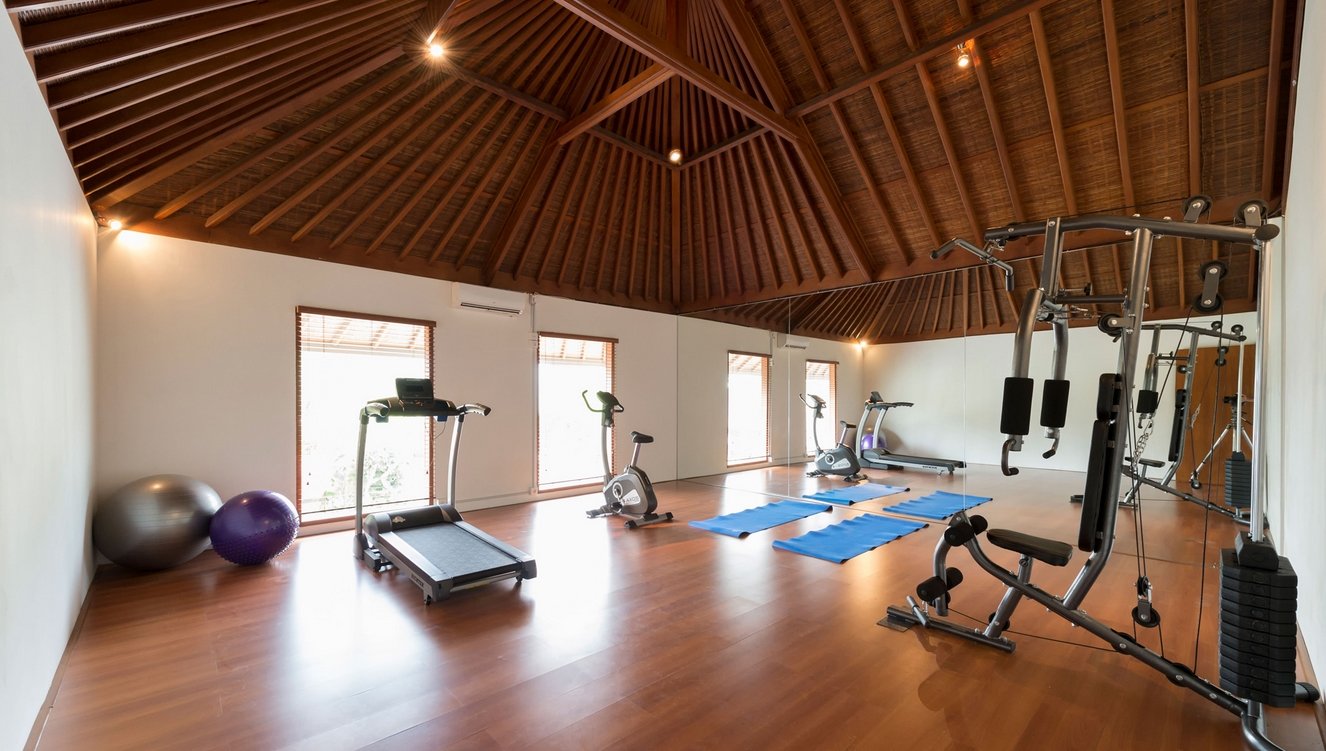 • Private gym with treadmill, exercise bike, weight machine, fit balls, and mats