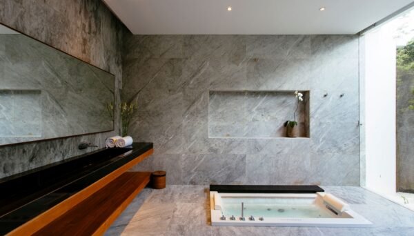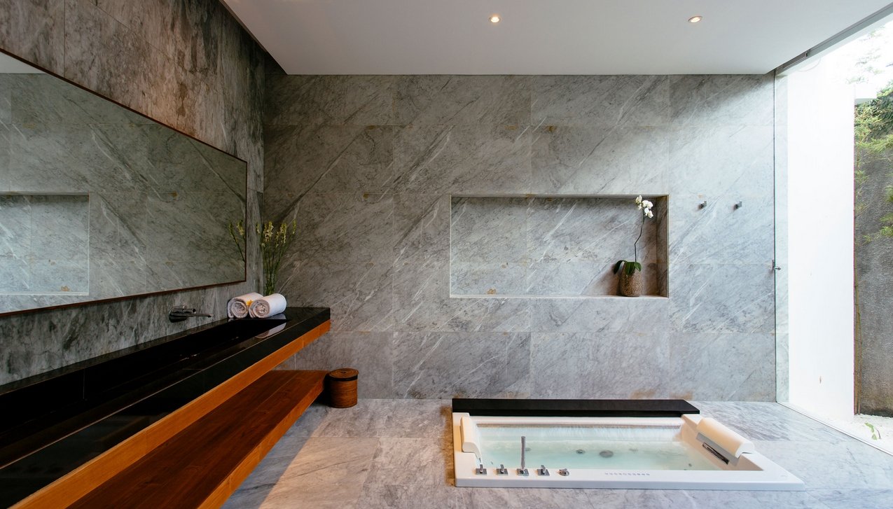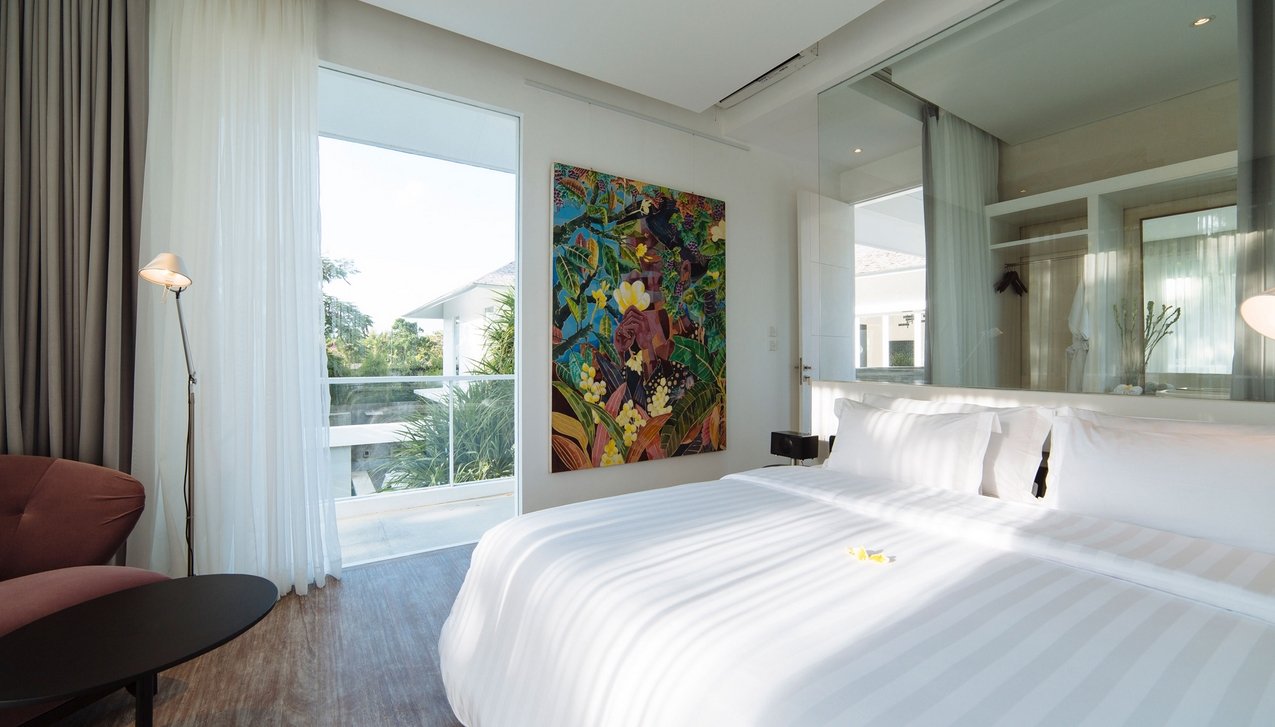 - Master Suite (Ground Floor): King bed, private terrace, sofa, marble ensuite with jacuzzi bathtub & rain shower