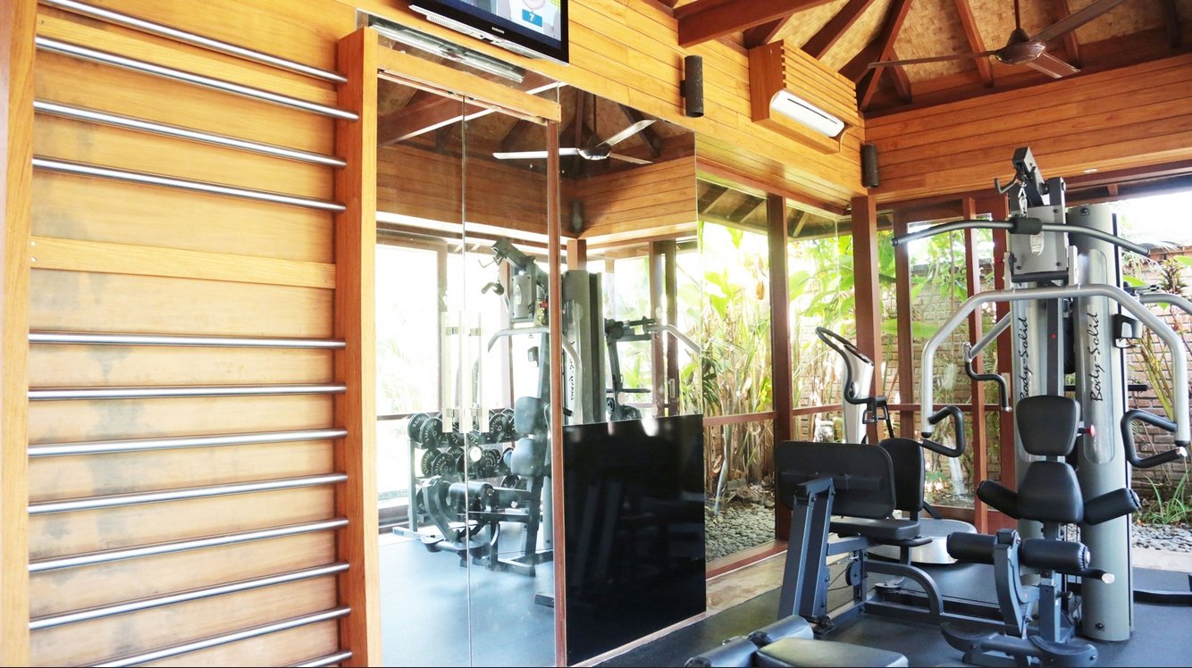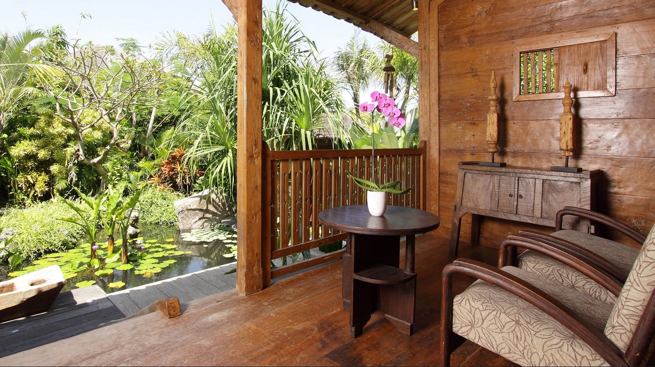 Doors lead to a small kitchenette on one side and a wardrobe and dressing area on the other; both the kitchenette and dressing room open onto a tropical garden bathroom. Across the pond is a second and much smaller gladak which serves as a reading or breakfast room, while across the swimming pool a relaxation balé beckons.