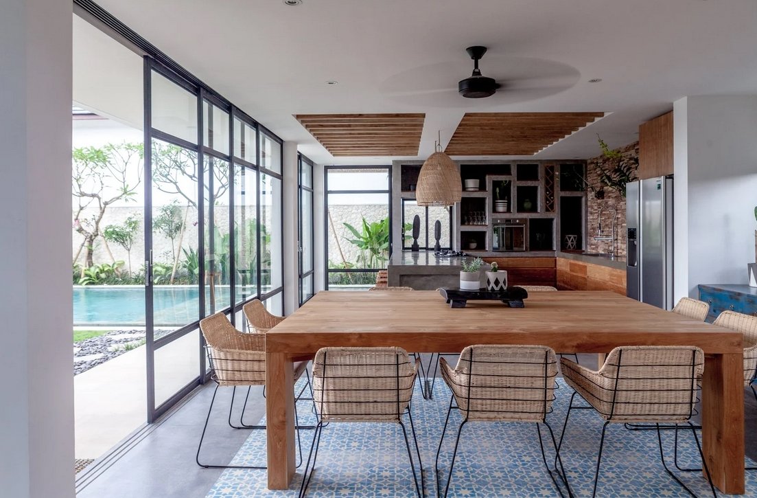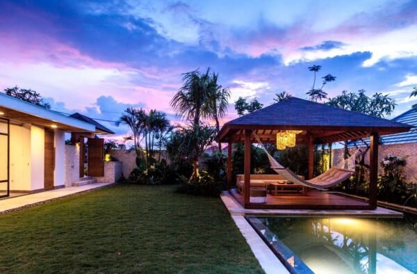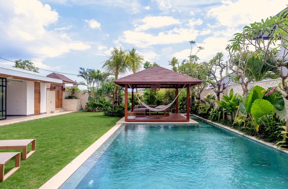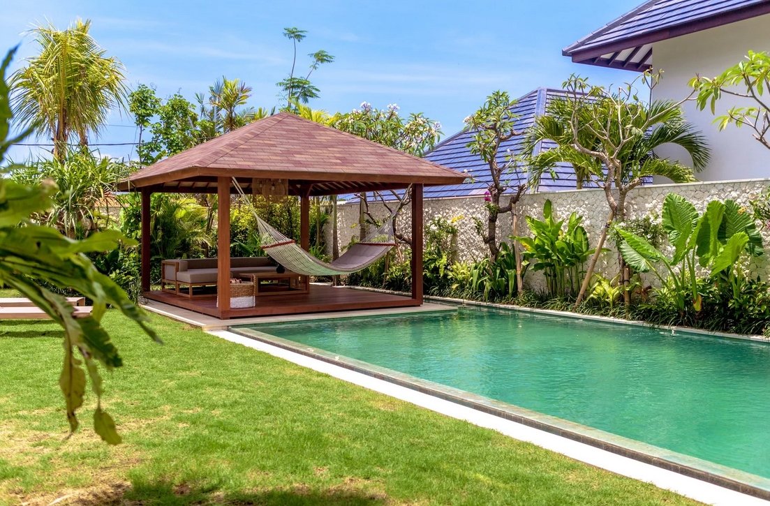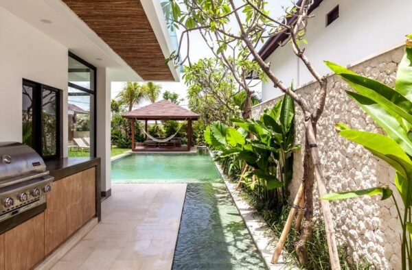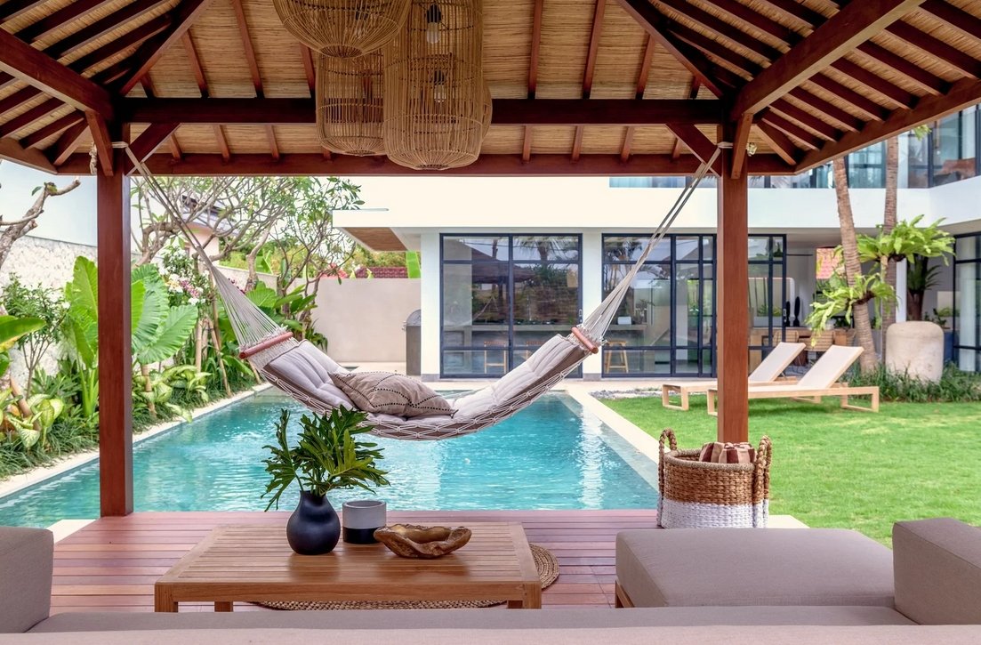 The enclosed dining and kitchen areas sit side by side, creating a warm and social space for shared meals. The air-conditioned living room features a Smart TV with Netflix — perfect for laid-back evenings. Step outside to a poolside gazebo with a sofa and hammock, where time slows down and relaxation takes over.