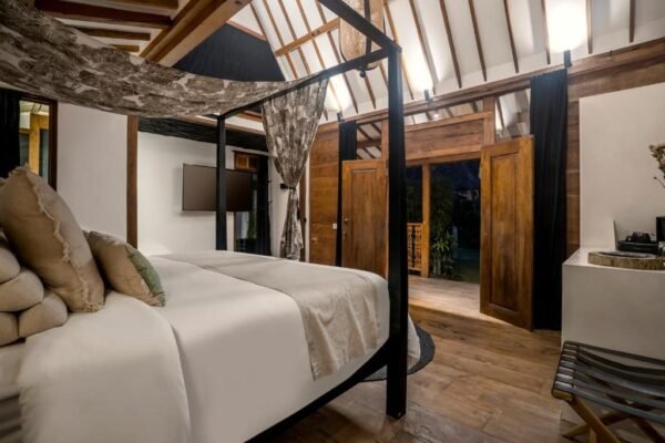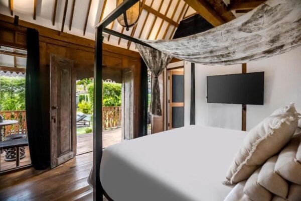 As you descend into the villa grounds, you’ll be greeted by a tranquil oasis of wood-carved Joglos and Gladaks, traditional Indonesian structures transformed into stylish and comfortable private suites. These historical buildings are woven into the landscape, with open-air living spaces, garden paths, and natural cooling breezes.
