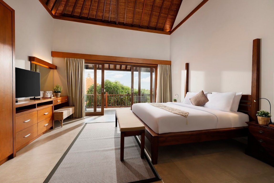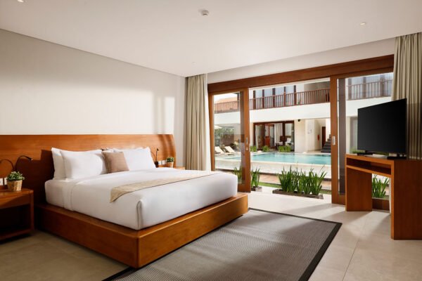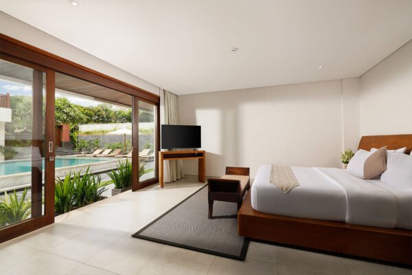 The master suite in the 3BR villa opens to a private patio and pool view, with an indulgent bathtub and walk-in closet. The second and third bedrooms also include bathtubs, large wardrobes, and peaceful balconies.