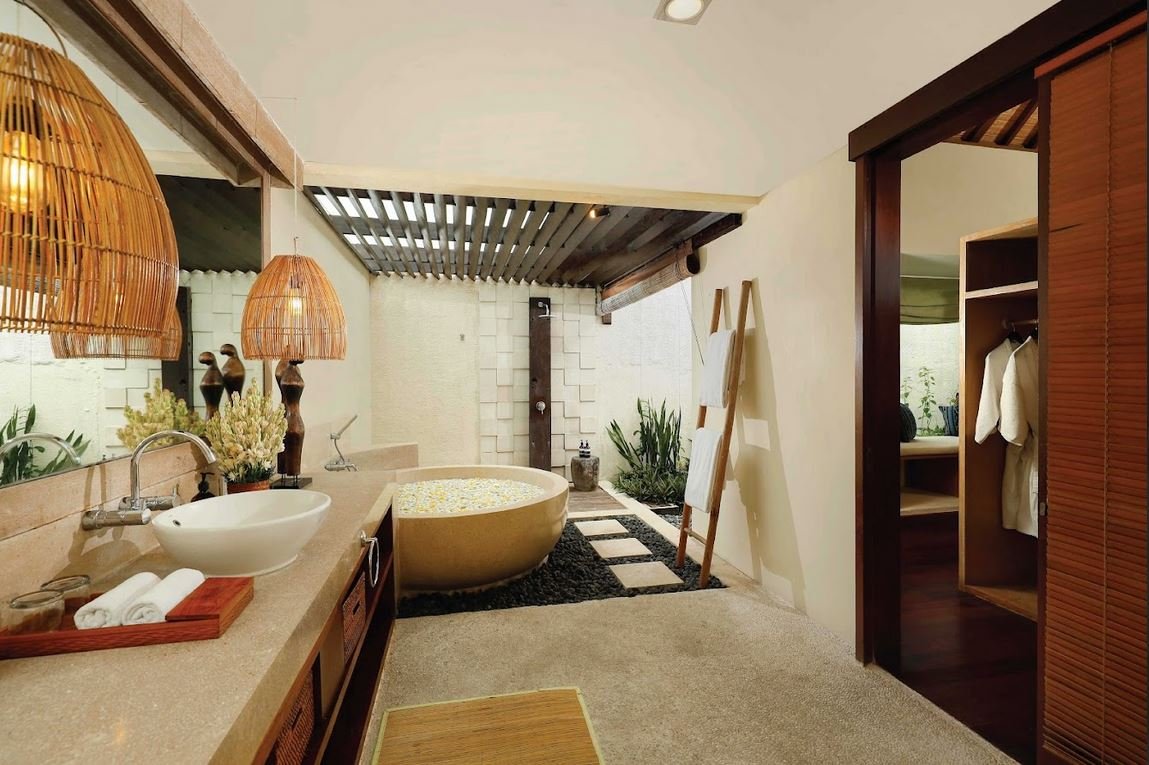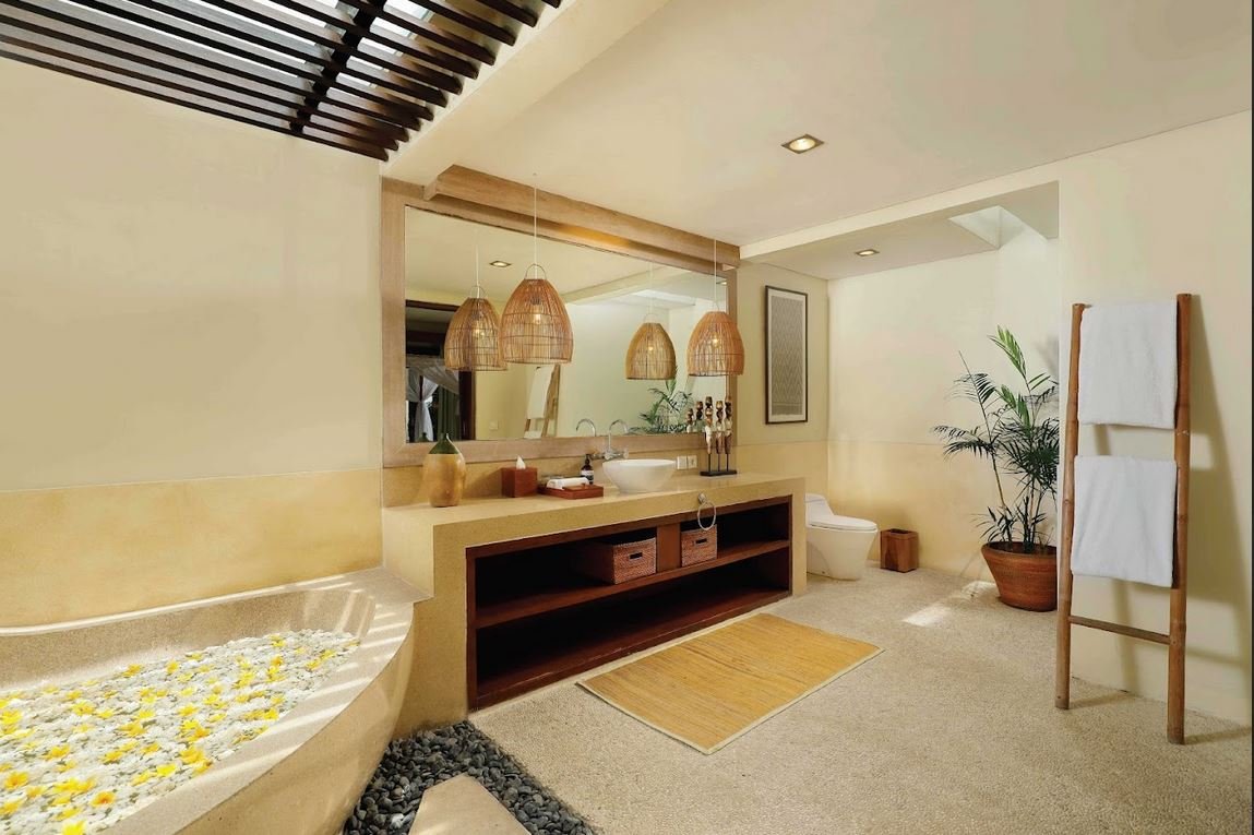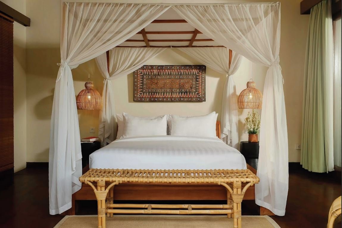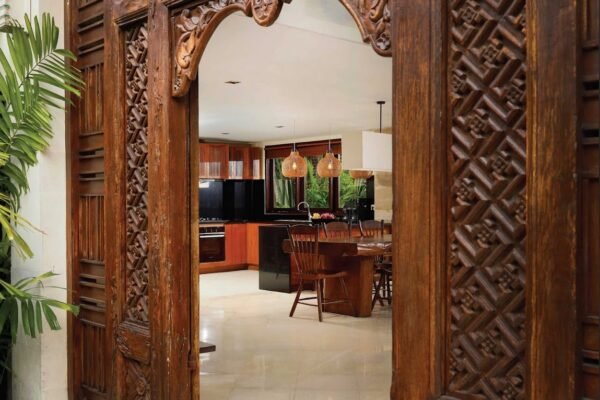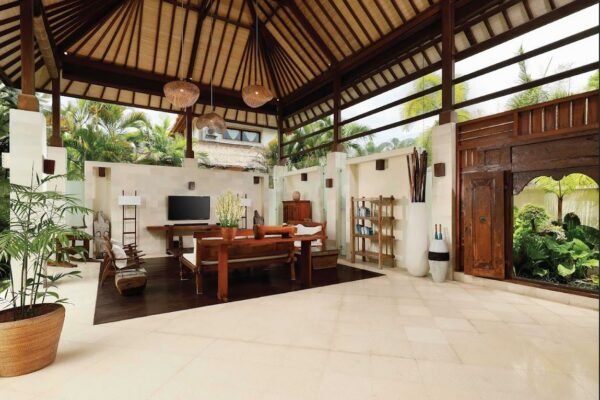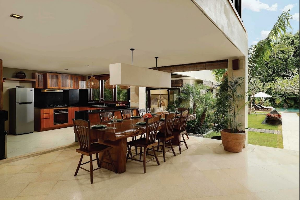 The villa welcomes you with a traditional Javanese-style entrance that opens into a breezy open-plan living and dining area.