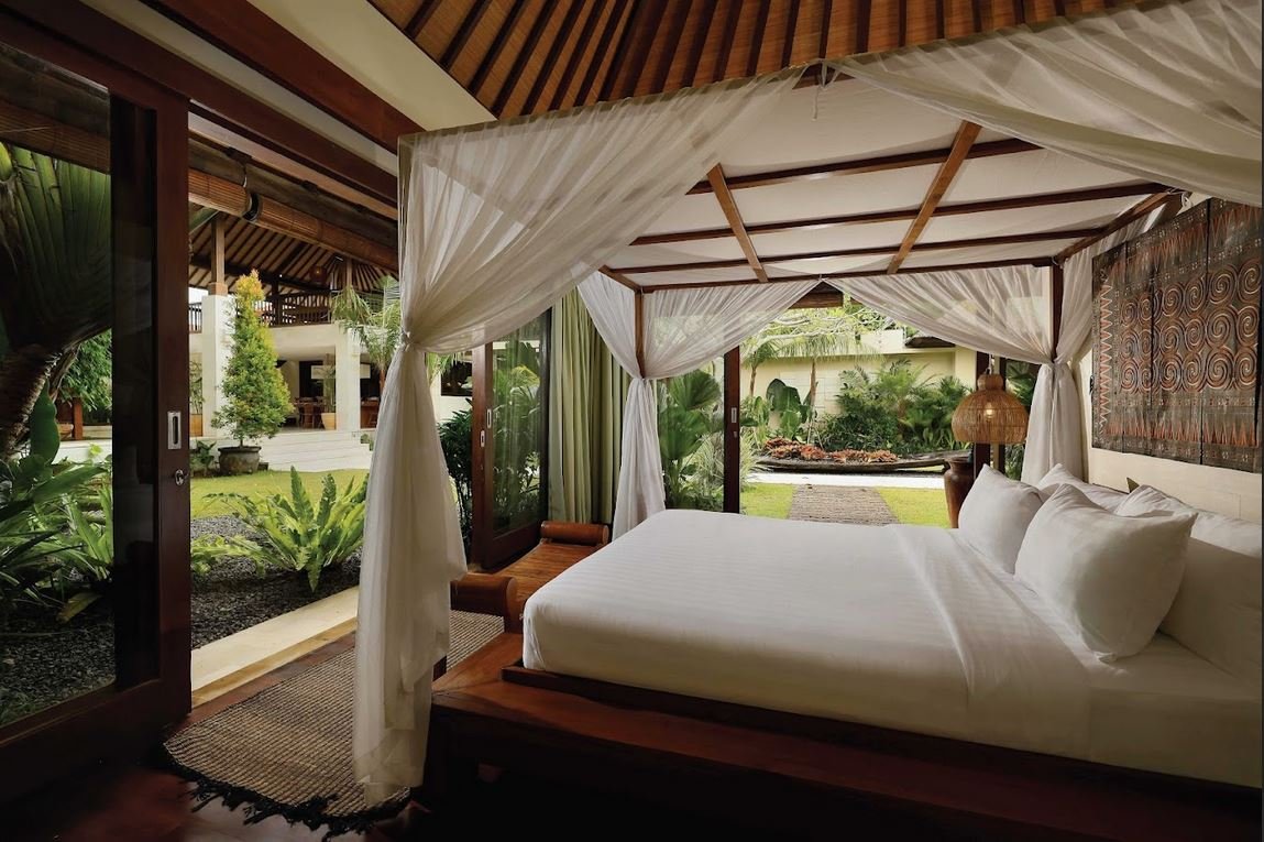 Five thoughtfully designed bedrooms are spread across separate buildings, each with its own ensuite bathroom and tropical garden views.