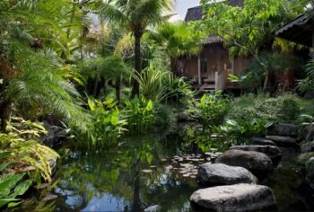 Doors lead to a small kitchenette on one side and a wardrobe and dressing area on the other; both the kitchenette and dressing room open onto a tropical garden bathroom. Across the pond is a second and much smaller...