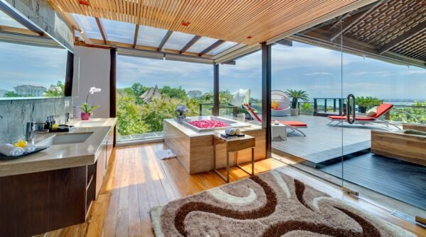 Perched high above Jimbaran Bay, this architect-designed villa blends traditional Balinese elegance with sleek modern design. Floor-to-ceiling glass panels invite sunlight and panoramic ocean views, while polished wood floors, serene water features, and an 18-meter infinity pool add a sense of indulgent calm.
