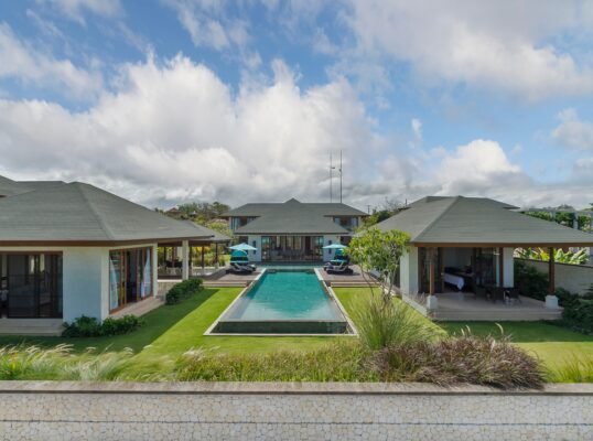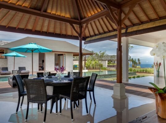 Perched high above the Indian Ocean on Bali’s dramatic Bukit Peninsula, this spacious 6-bedroom villa offers a serene and secluded setting — perfect for family holidays, group getaways, and unforgettable weddings. Set within a private luxury estate, the villa combines traditional Balinese design with lush tropical gardens, a 16-meter private pool, and sweeping ocean views from nearly every room.