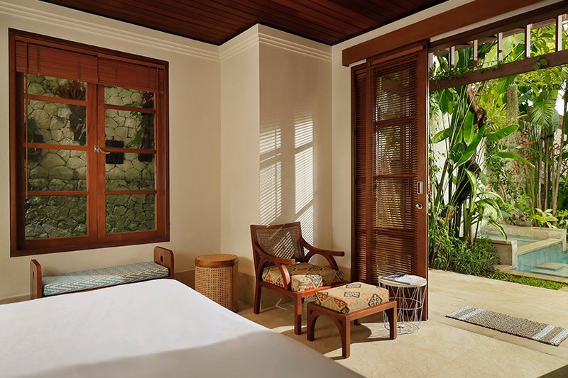 Two separate pavilions create a beautiful flow between the living area and bedrooms, with the sparkling pool and garden in between. Large glass doors, warm wooden details, and tropical plants bring the outside in, while calming blue accents and soft lighting add a sense of elegance and relaxation.