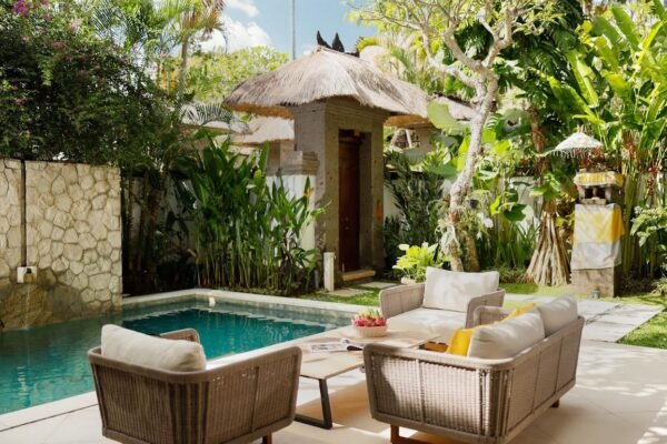 Tucked away in a serene gated compound in the heart of Jimbaran, this stunning 3-bedroom villa blends traditional Balinese charm with sleek contemporary design.