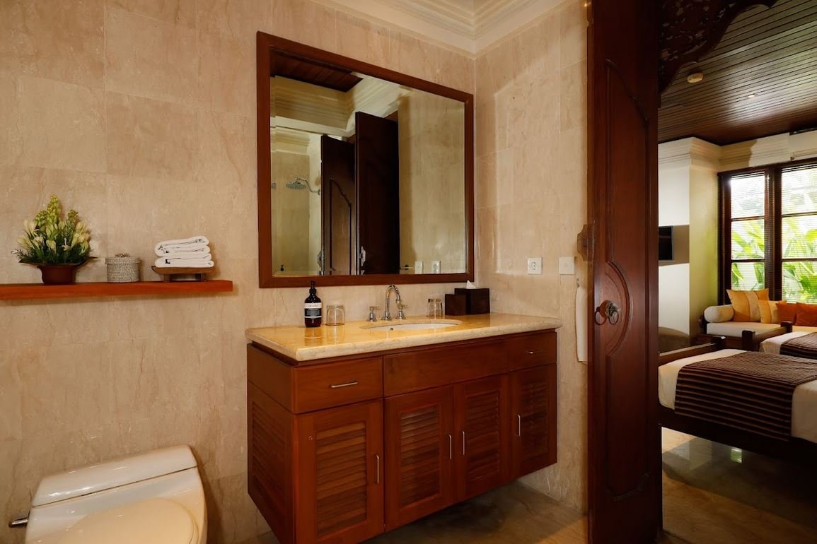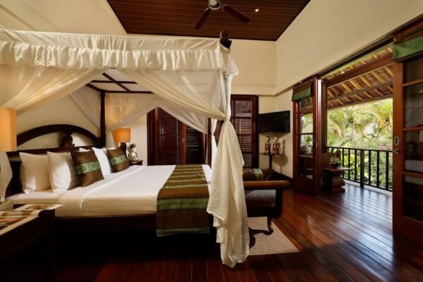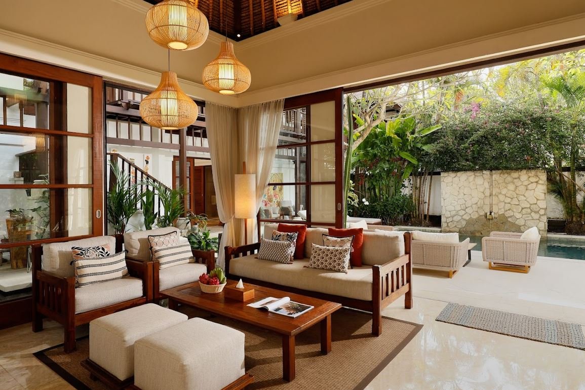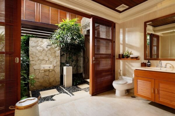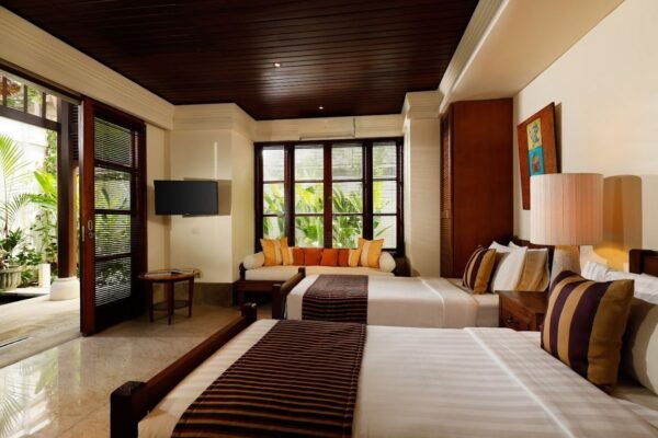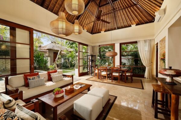 The villa offers three beautifully appointed bedrooms spread across two levels. The entire upper floor is dedicated to a luxurious master suite with a four-poster king bed and a private lounge area. Downstairs, you’ll find two additional rooms — one with a queen bed and another with twin beds — both with ensuite bathrooms and direct garden access. All rooms are fitted with hotel-grade linens, air conditioning, and resort-style amenities.