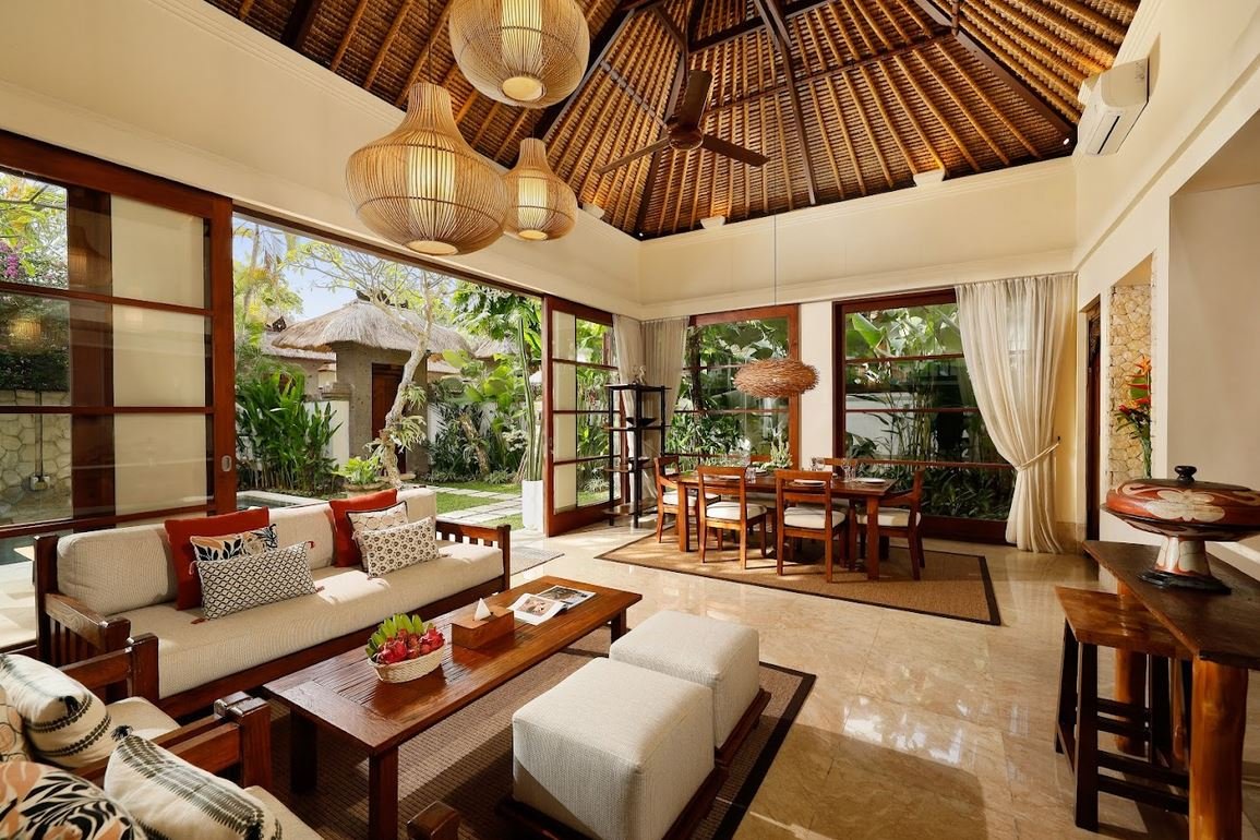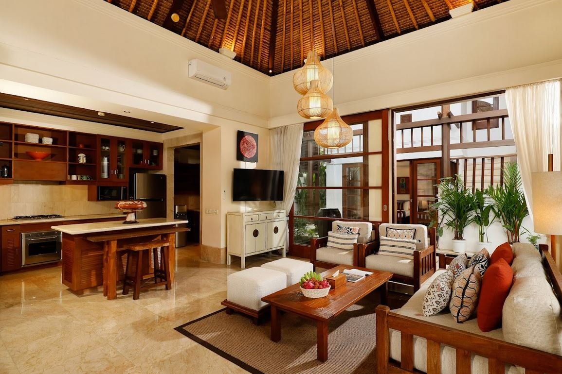 The main living pavilion is open and airy, framed by soaring thatched ceilings and floor-to-ceiling glass doors. Inside, you’ll find a cozy lounge area, a large dining table, and a fully equipped modern kitchen. Rich wood tones, curated artwork, and stylish furnishings create a warm, homey vibe with plenty of space for everyone.
