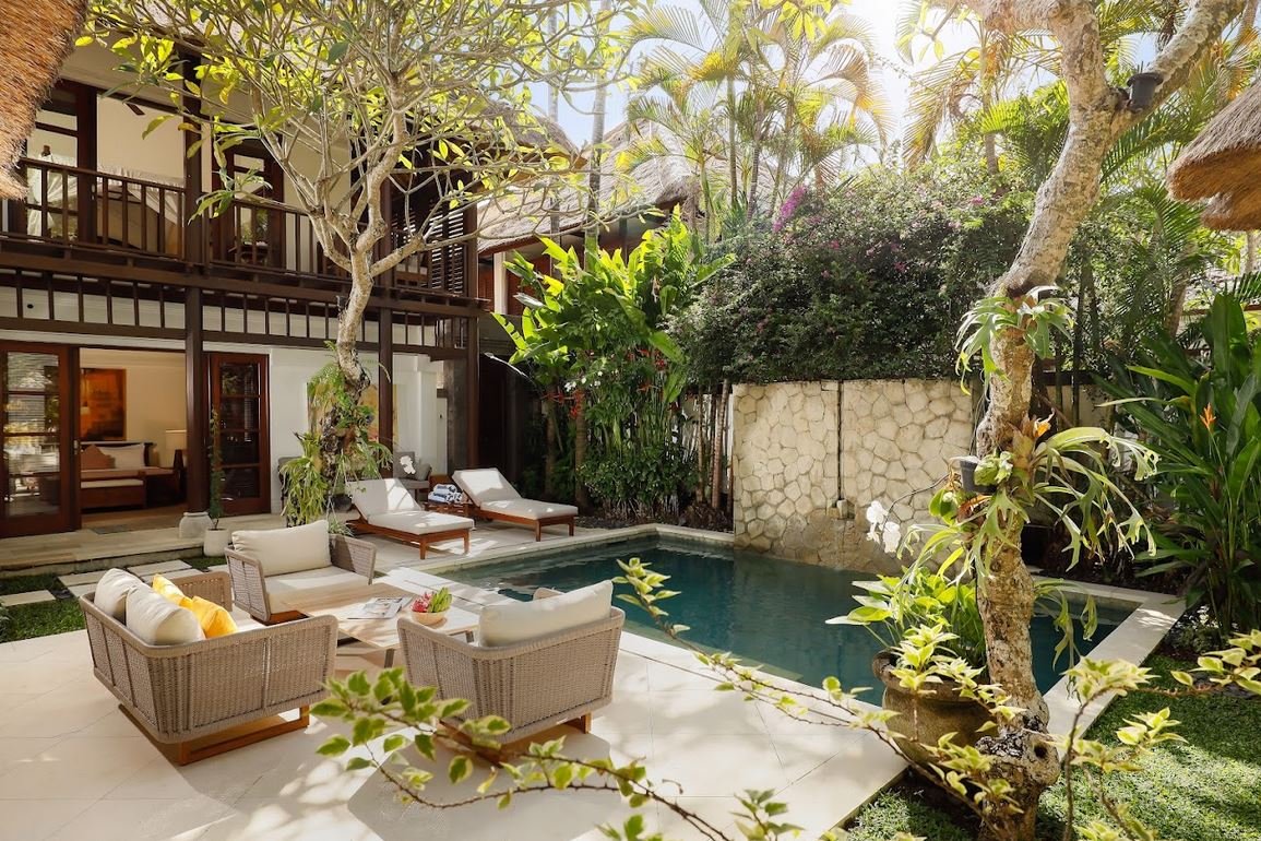 Set over two elegant pavilions, the property features a lush tropical garden, a private swimming pool, and expansive indoor-outdoor living spaces — perfect for families or groups of friends seeking a peaceful getaway within walking distance of the beach.