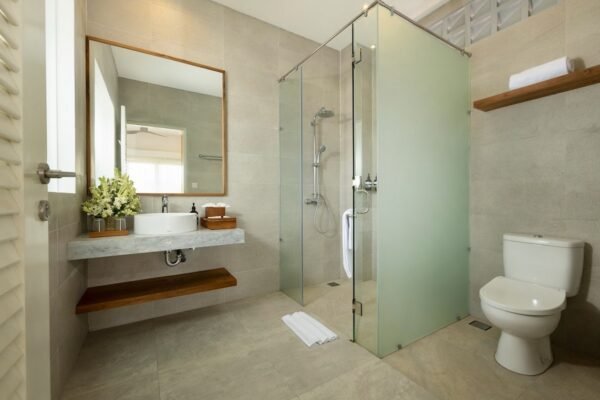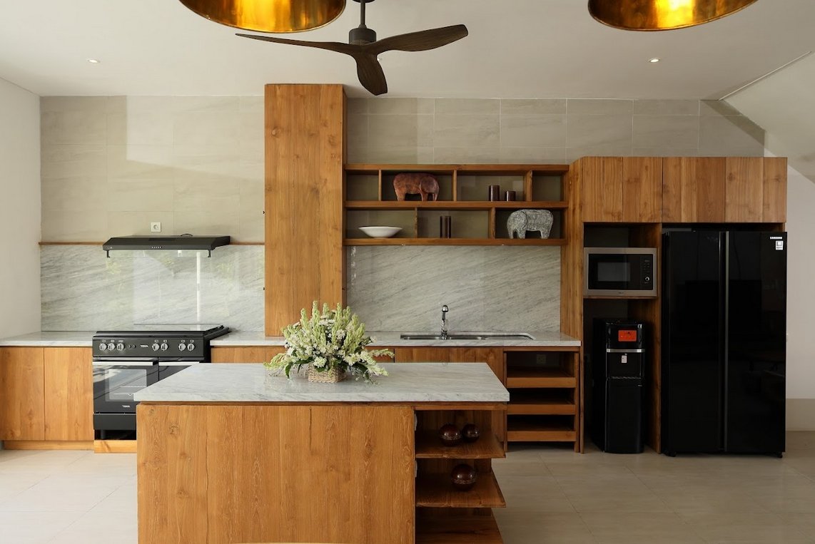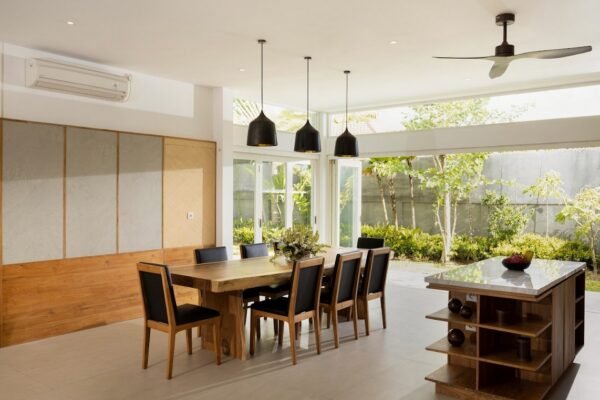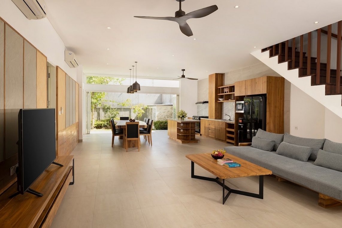 The villa’s open-plan living and dining area blends contemporary elegance with warm, natural finishes. High ceilings and bright accents create an airy, welcoming atmosphere.