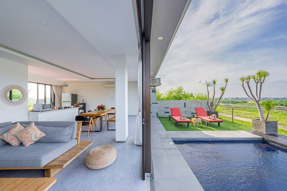 Step outside to a private 2.65m x 6m swimming pool, framed by a wooden deck and sun loungers. From here, you can take in the lush rice field panorama, watch the sunrise with a coffee in hand, or relax as the day drifts into golden hour. The outdoor terrace and pool area feel like an extension of the landscape, blurring the line between comfort and nature.