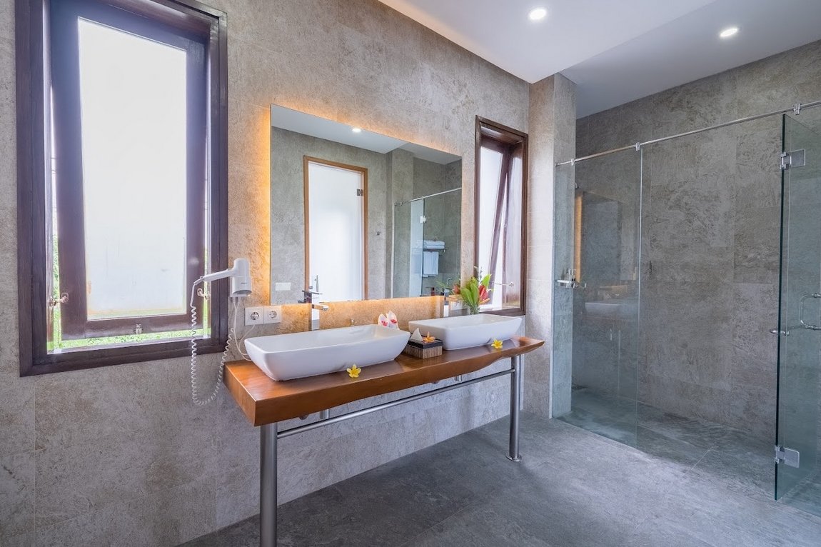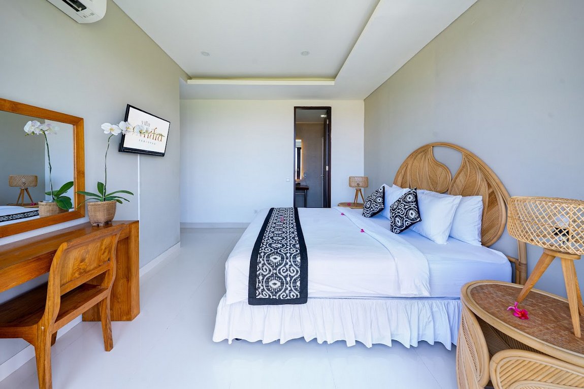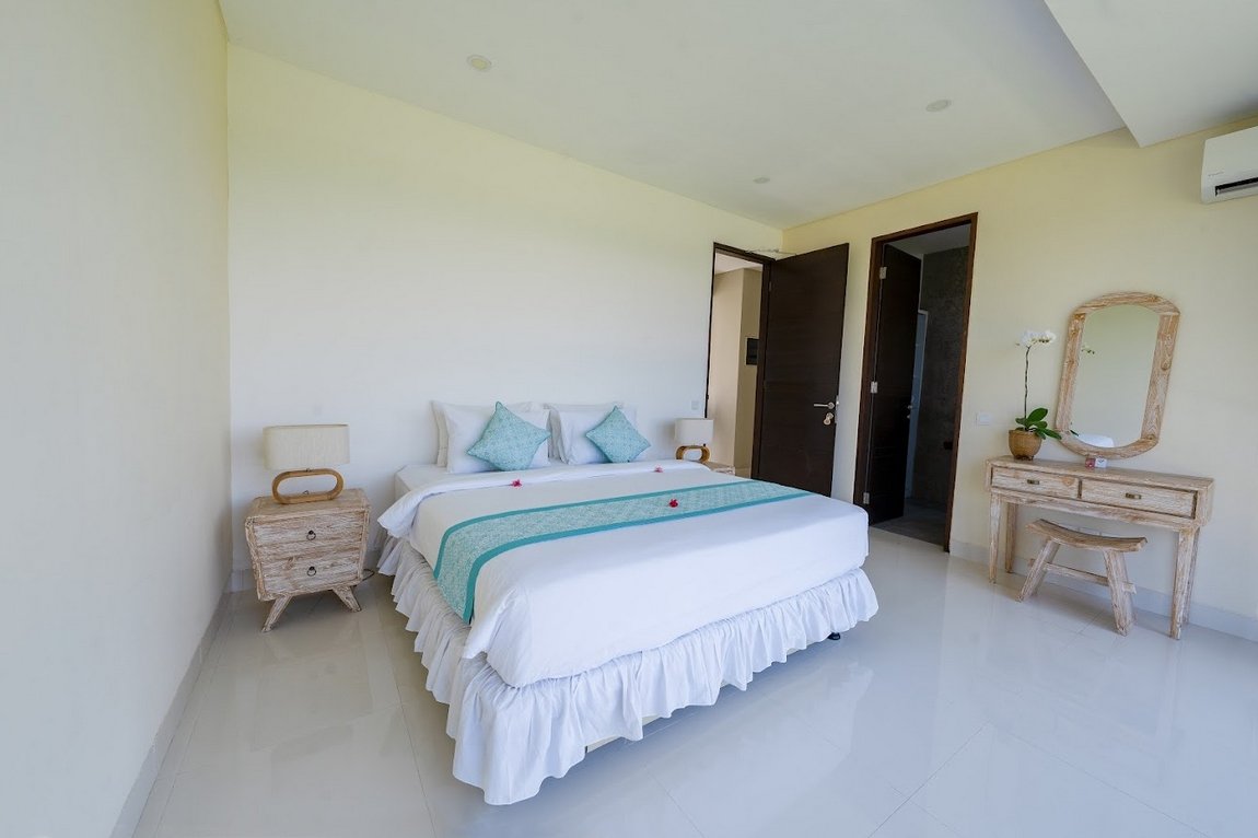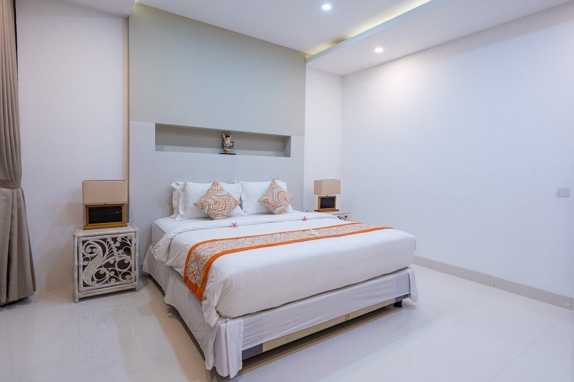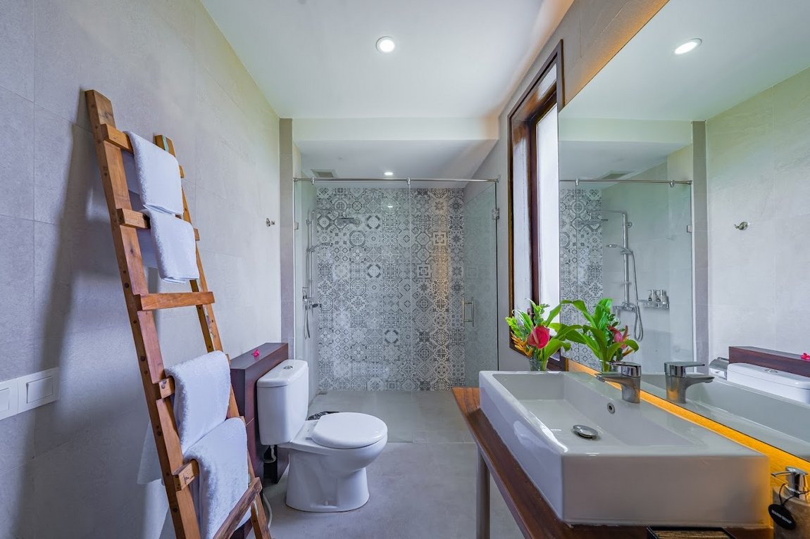 Four spacious bedrooms are spread across the villa, each featuring king-size beds with premium linens, air conditioning, and en-suite bathrooms. The master suite comes with a solid stone bathtub and garden views, creating a serene spa-like retreat. Each room is a blend of contemporary style and tropical warmth, ensuring restful nights after days of exploring.