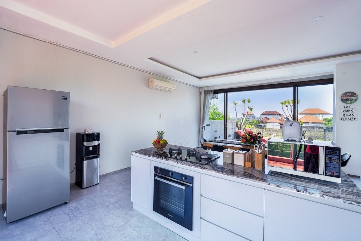 At the heart of the villa lies an open-plan living room with plush sofas and curated local artworks. It opens seamlessly to the outdoor terrace, making it easy to drift between cozy lounging indoors and sun-soaked relaxation outside. The dining area is elegant yet inviting, perfect for enjoying meals with family or friends. A fully equipped designer kitchen — complete with stove, microwave, refrigerator, and hot/cold water dispenser — is available for those who enjoy home-style cooking.