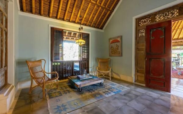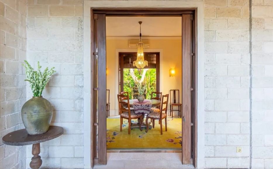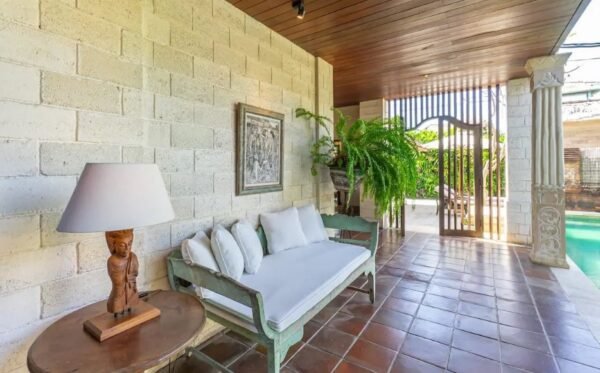 Located in the tranquil and lush neighborhood of Sanur, Villa is the epitome of authentic Balinese living of high society from a distant past, with modern comfort and distinctive rustic design elements throughout. This gated compound exudes effortless charm from the moment you arrive at the highly ornate door. Tall thatched roof with open plan layout promotes a breezy space with natural light in abundance in all living spaces.
