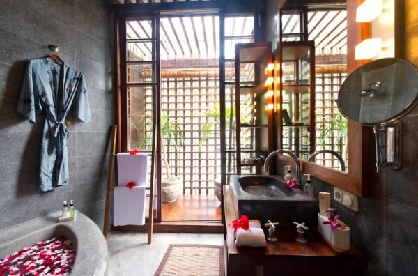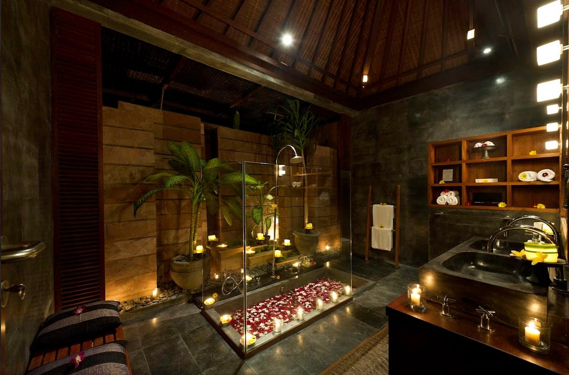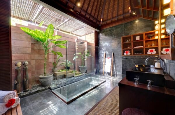 • Semi-open-air bathrooms with sunken tubs, rain showers, and tropical plants