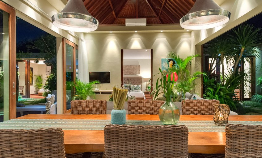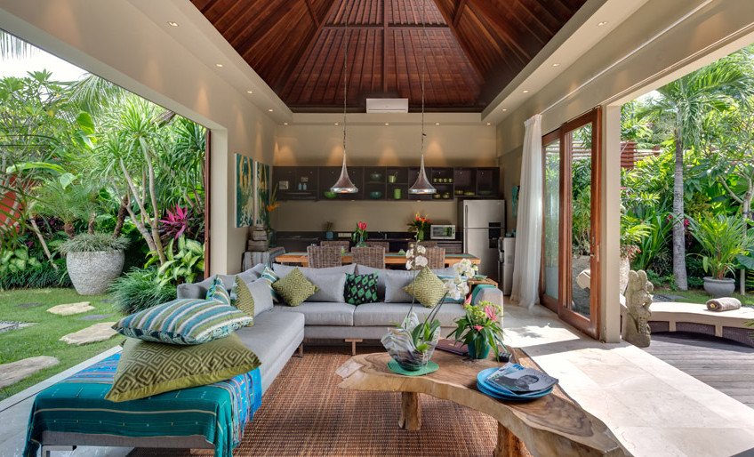 The high-pitched roof of Villa’s living area and the vast glass doors on both sides only add to the volume of an already spacious room that boasts a large sofa, elegant marble floors and a dining table for eight. At one end is an open-plan kitchen equipped for guest use.