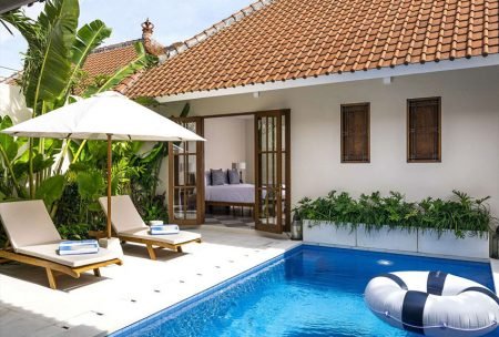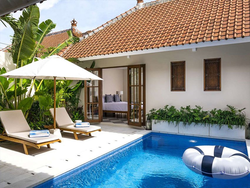 The Seminyak Villa featuring two comfortable king-sized, air-conditioned bedrooms with en suite; deluxe pillowtop bedding; open plan kitchen, dining, lounge area with vaulted ceilings; overhead fans for additional comfort, features a stunning central swimming pool and ample outdoor decking, Villa has all that you need for your perfect Bali holiday.