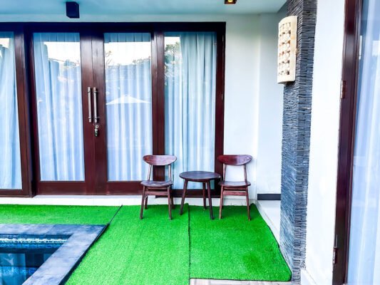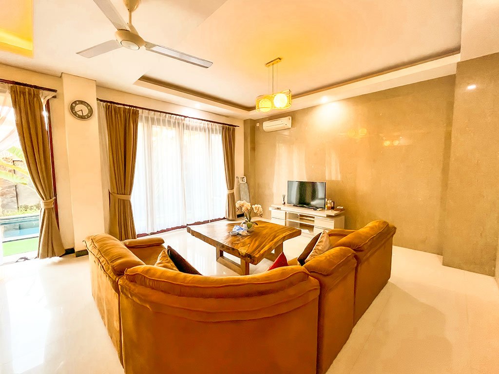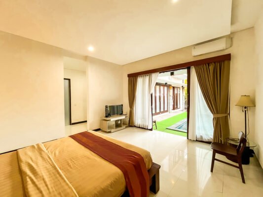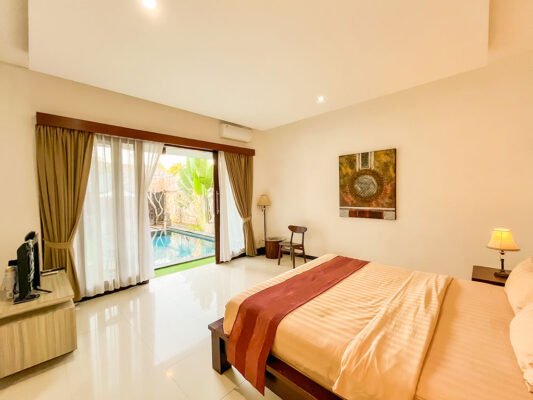 The villa features spacious bedrooms with attached bathrooms, and an open living and dining area that overlooks a refreshing indoor swimming pool. Enjoy the gentle Bali breeze and warm sunlight right from your living space.