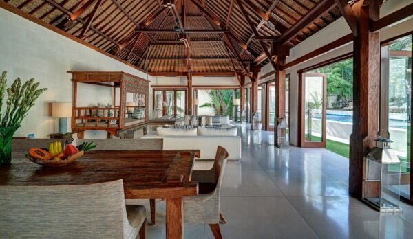 Spend your mornings with a refreshing swim in the 14-metre pool, a session in the private gym, or a slow breakfast prepared by the villa team in the open-sided dining pavilion. Afternoons are for lounging—whether in the media room for movie marathons, napping in the poolside bale, or swaying in the hammock under the trees. Evenings are best spent dining alfresco under the stars or hosting a barbecue by the pool.