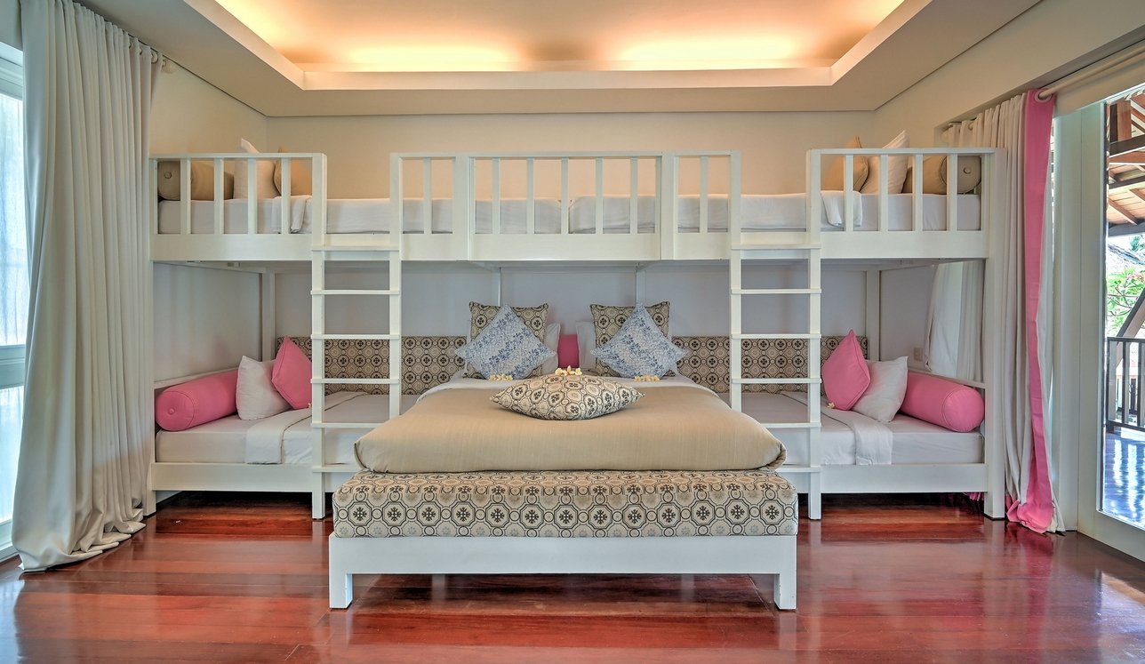 Each bedroom is designed for comfort and privacy, with ensuite bathrooms and TVs. The downstairs master suite boasts a spa-like bathroom, while the upstairs rooms open to balconies overlooking the gardens. Kids will love their own bunk room, comfortably sleeping up to five—perfect for cousins or friends traveling together. This villa is as family-friendly as it is luxurious.