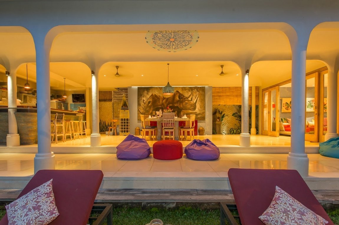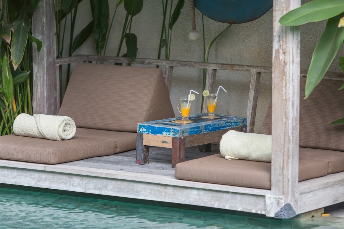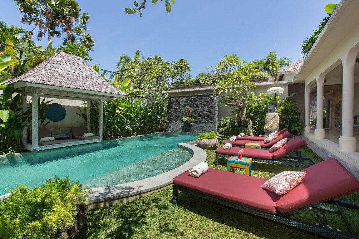 At the heart of the villa lies a 12 x 4 meter private swimming pool, surrounded by sun loungers and a shaded bale for lazy afternoons. The tropical garden frames the space beautifully, giving it a secluded, relaxing feel despite its central location.
