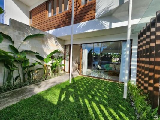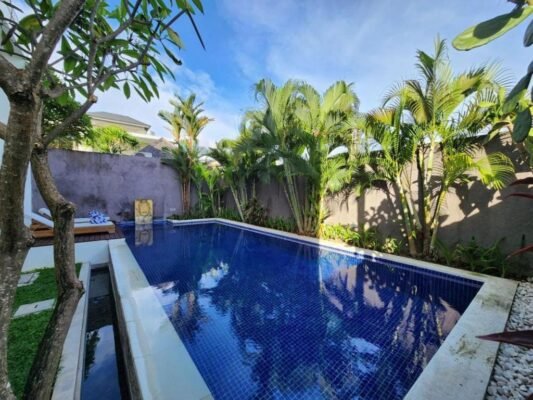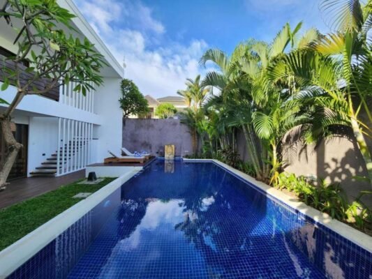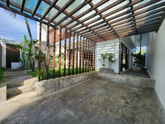 Villa ini dirancang dengan gaya tropis modern yang memadukan taman hijau, material kayu alami, dan ruang terbuka yang nyaman.