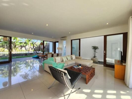 Villa memiliki ruang tamu indoor yang nyaman dengan desain terbuka yang menyatu dengan taman.