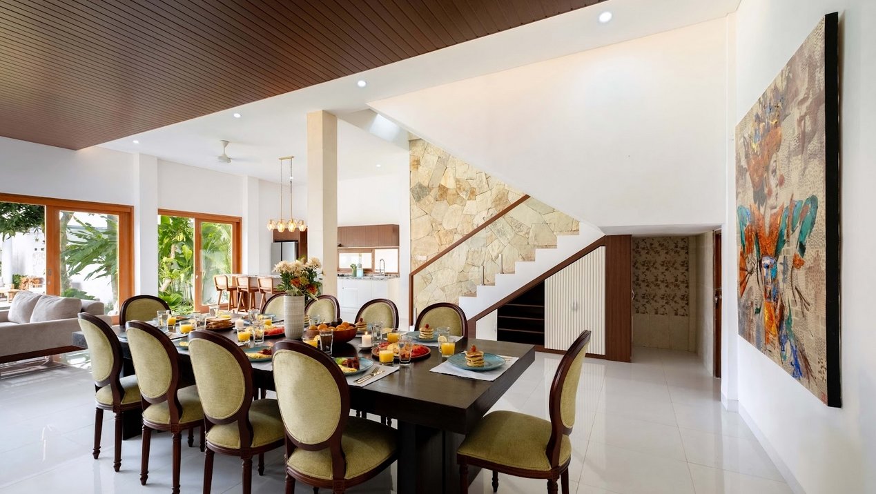 Enjoy a seamless blend of contemporary design and Balinese accents. The enclosed living room offers plush sofas and natural light through glass doors. The adjacent dining area seats up to 12 guests around a large table. A state-of-the-art kitchen is fully stocked for everything from quick snacks to chef-prepared dinners.