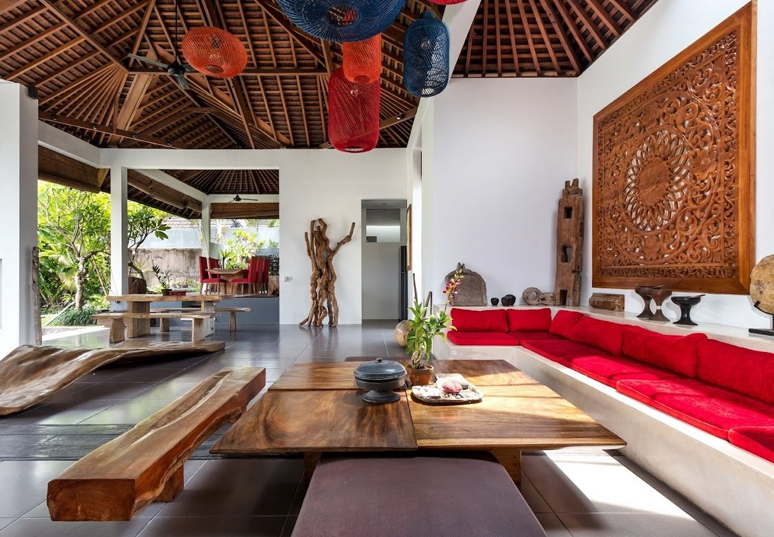 The open-plan living areas blend modern minimalist design with ethnic accents. Features include: