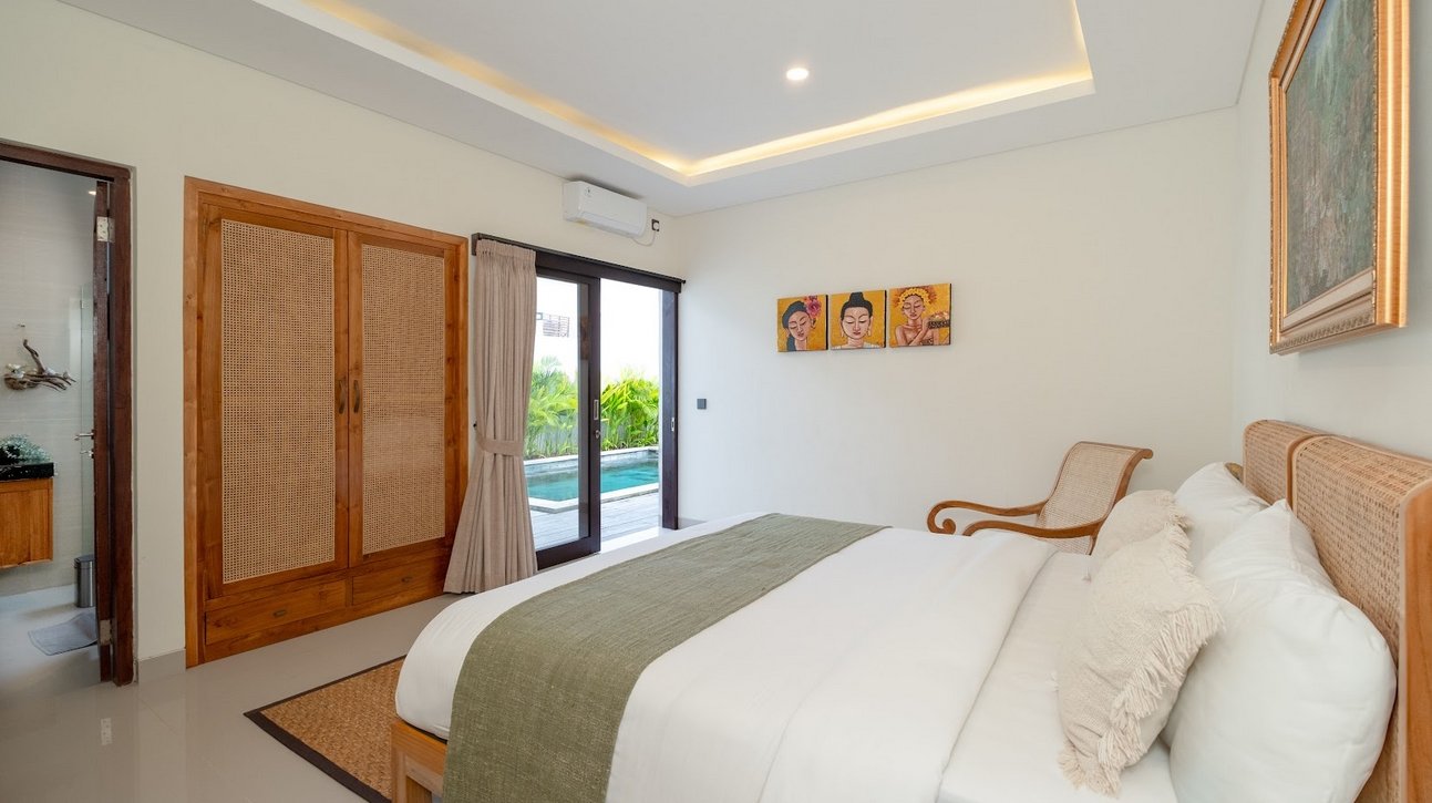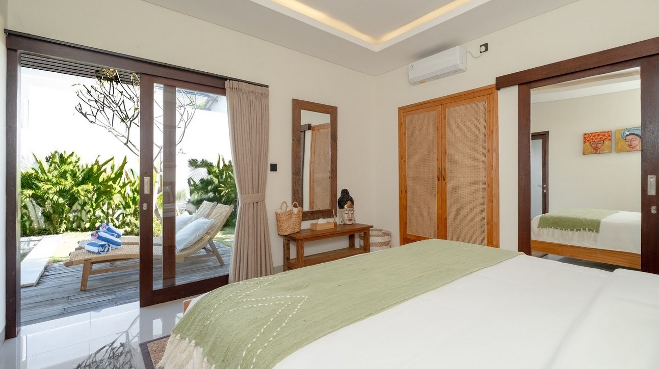 Both rooms are air-conditioned and come with soft linens, toiletries, and wardrobe space. Floor-to-ceiling windows open directly to the pool and garden, creating a bright, airy feel.