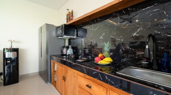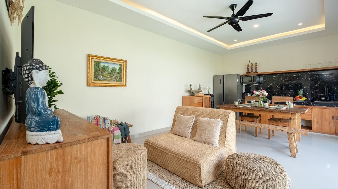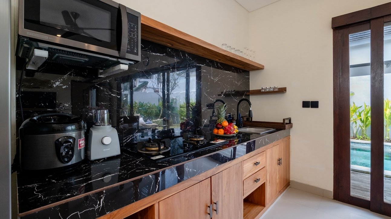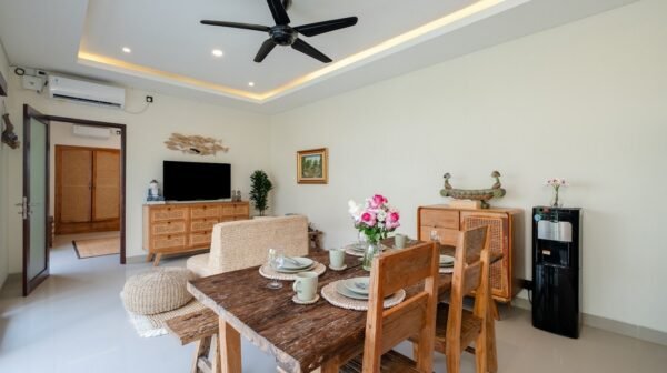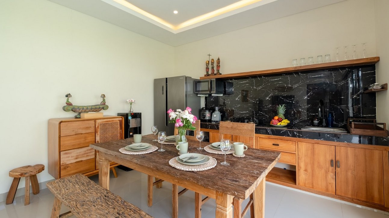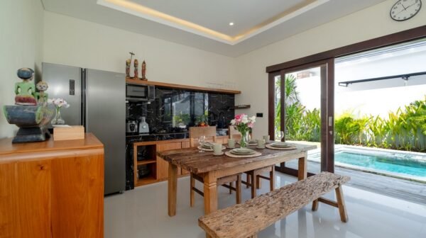 Inside, the villa offers a cozy enclosed living room with air conditioning, decorated in a modern Balinese style. The space flows into a dining area and a fully equipped kitchen with microwave, stove, coffee maker, and cooking essentials—perfect for preparing snacks or meals at home.