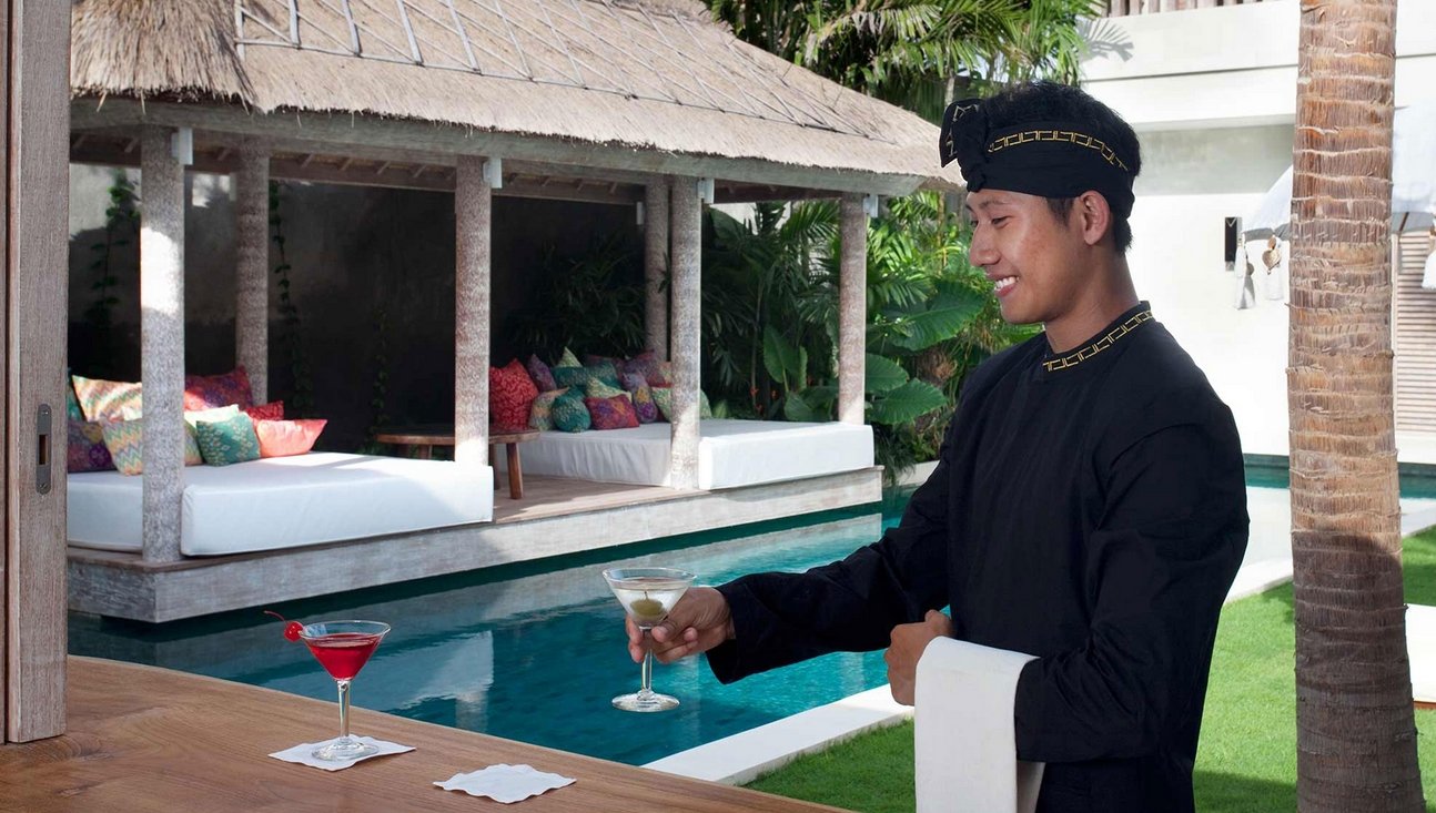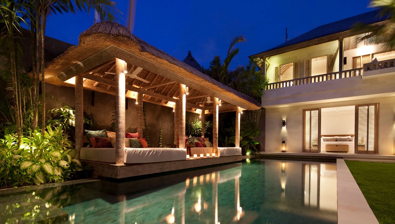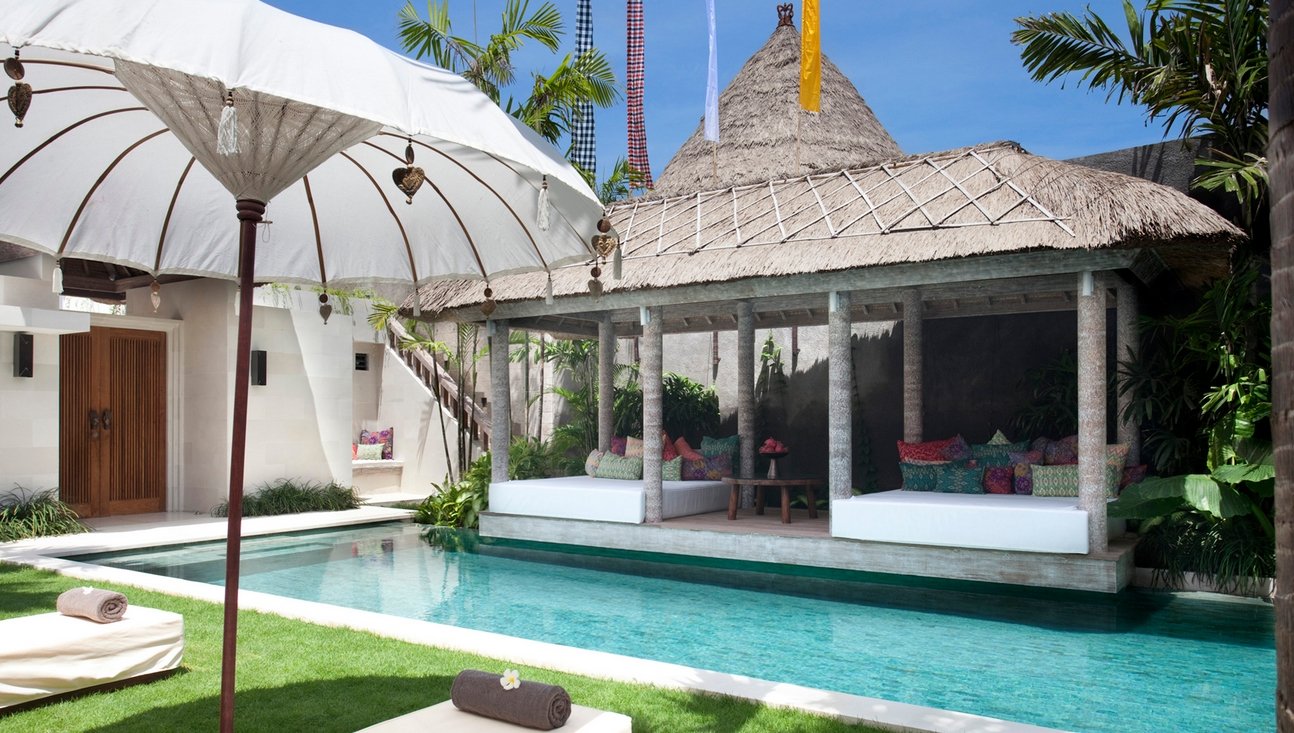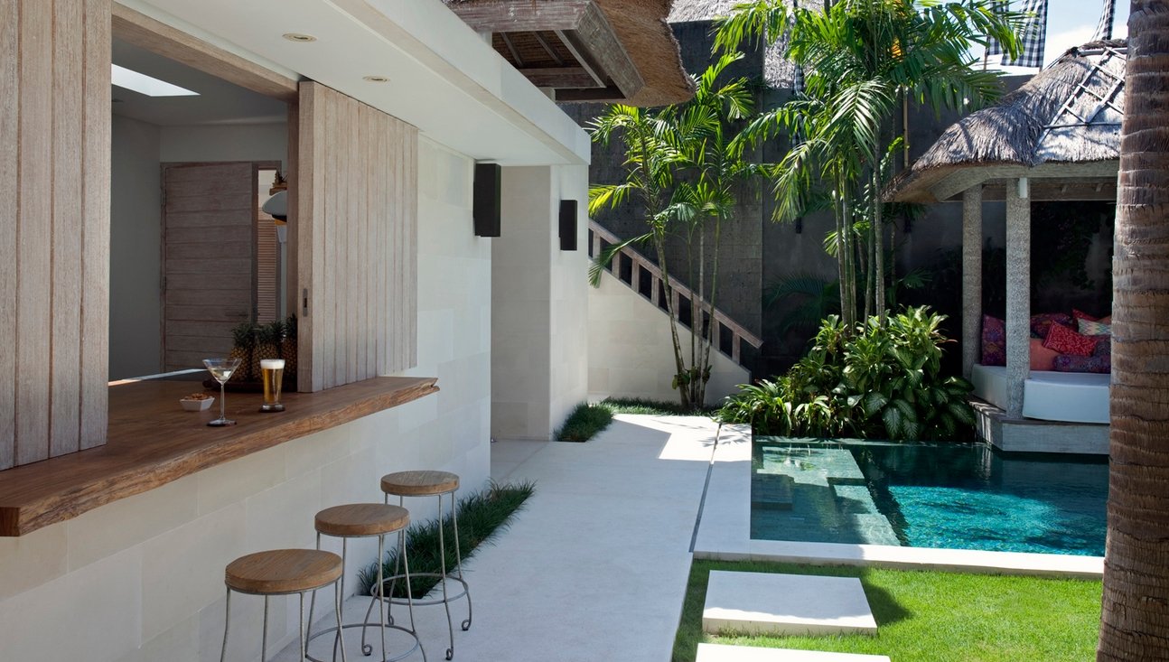 Set amongst lush tropical gardens, the three bedroom the villa is a haven for lounging and relaxation. Suspended above the 14-metre green-stone-tiled swimming pool, a traditional bale provides the perfect spot to while away the day.