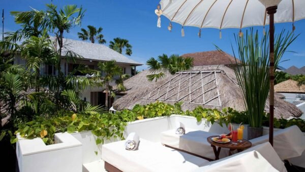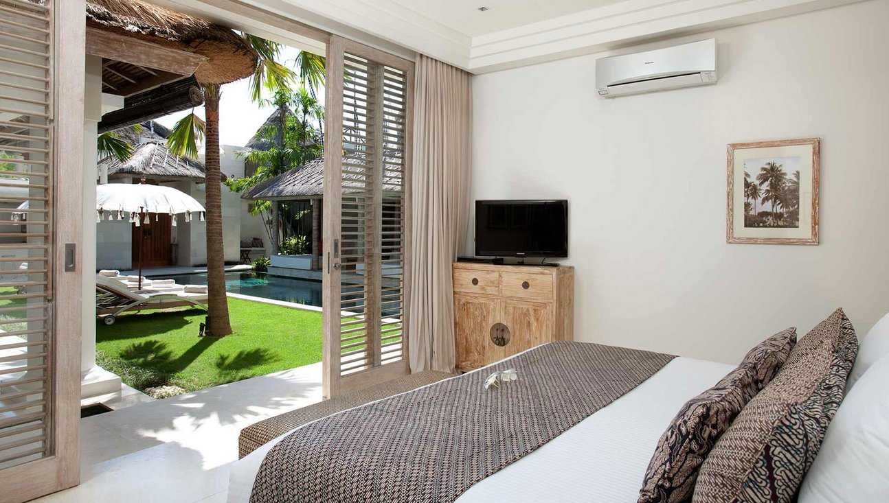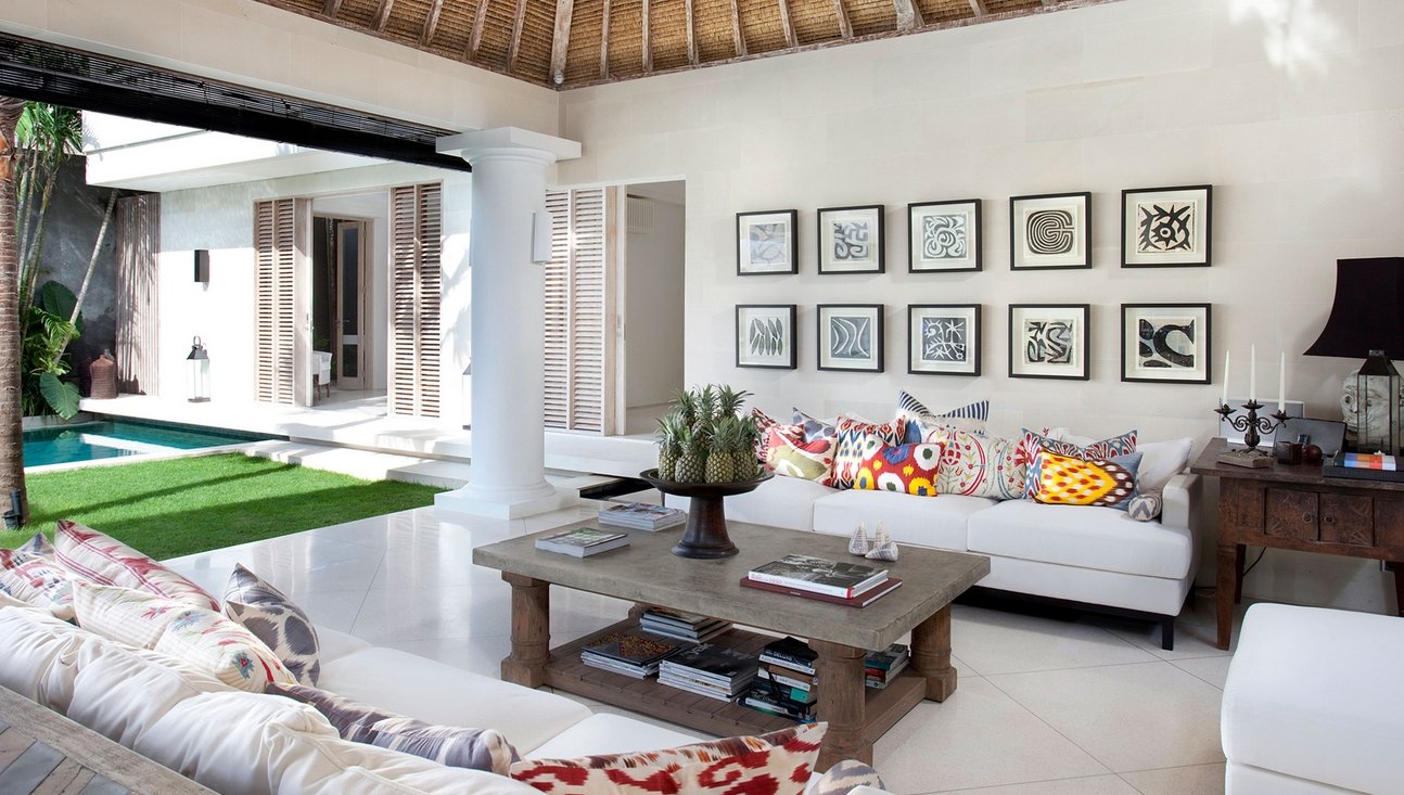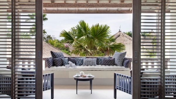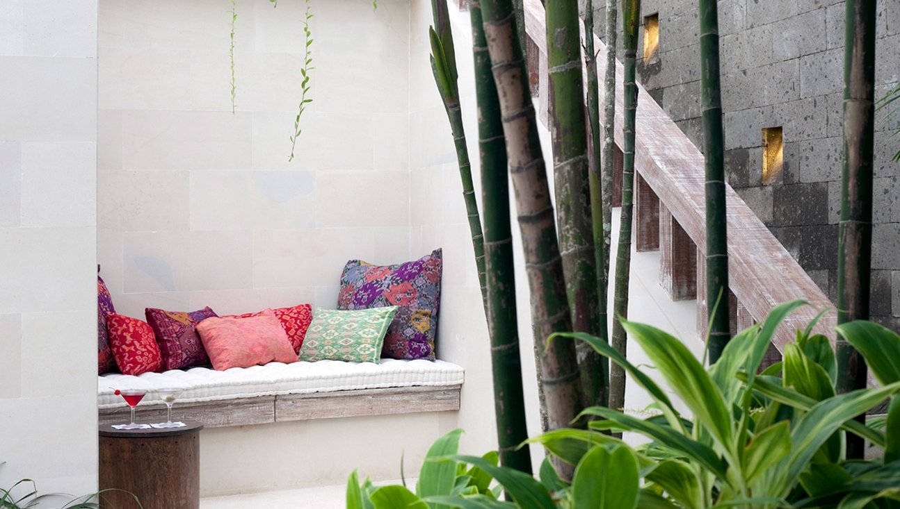 Set amongst lush tropical gardens, the three bedroom the villa is a haven for lounging and relaxation. Suspended above the 14-metre green-stone-tiled swimming pool, a traditional bale provides the perfect spot to while away the day.
