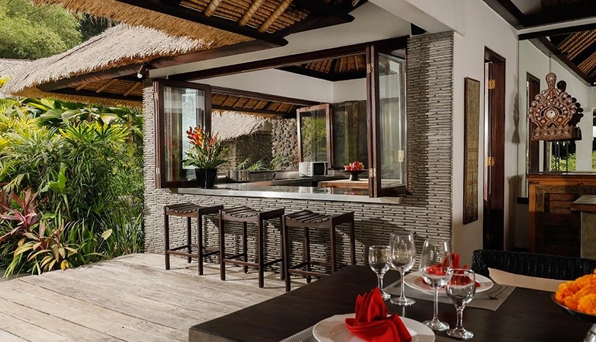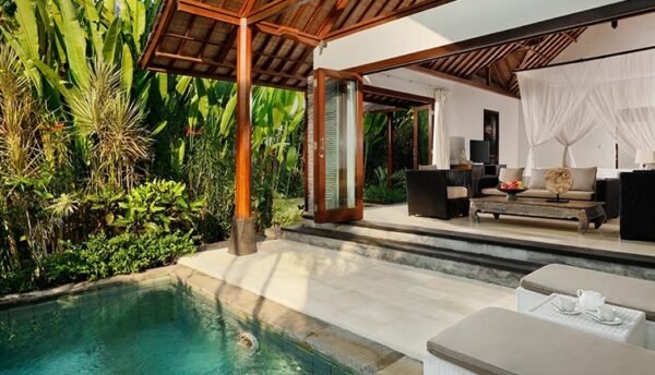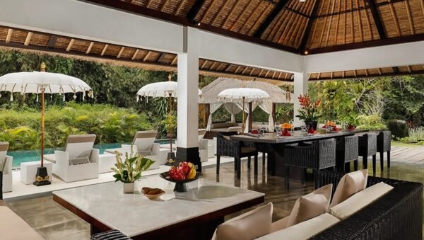 Nestled within the lush embrace of a jungle-clad river gorge near the serene village of Kaba-kaba in Bali’s Tabanan Regency, this riverside suite offers a sanctuary for the soul. Blending traditional thatched-roofed pavilions with the beauty of towering bamboo and the Penet River, the property emerges as a retreat deeply rooted in nature.