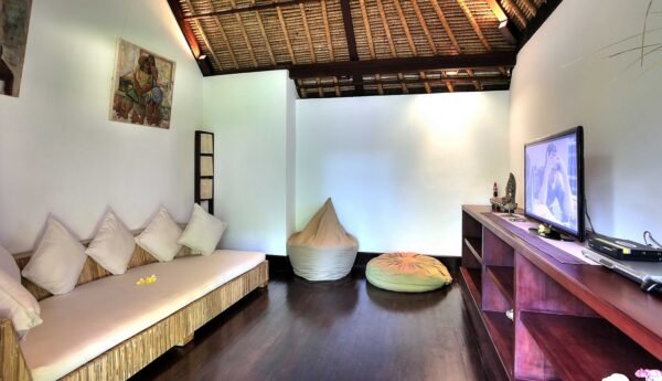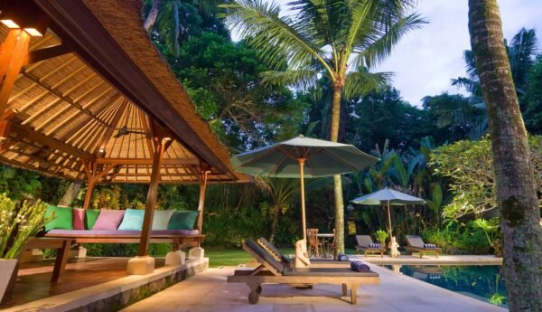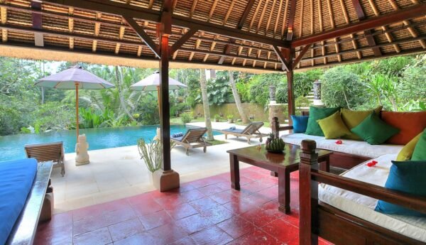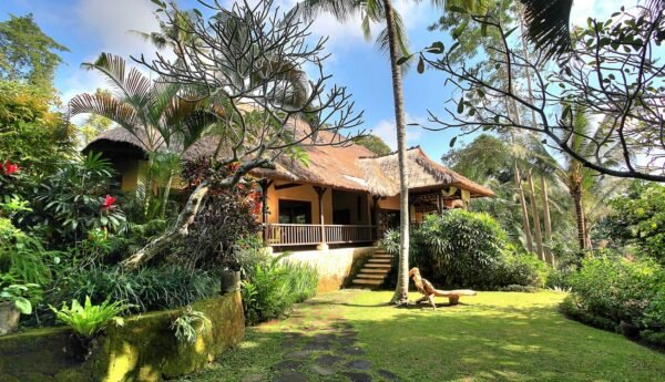 Perched high above a jungle-covered river gorge near Ubud, this elegant 4-bedroom villa blends classic Balinese architecture with serene natural surroundings. Enjoy breezy open-air living, stylish interiors, and a large tropical garden — perfect for families, friends, or those seeking a peaceful retreat in the cultural heart of Bali.