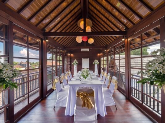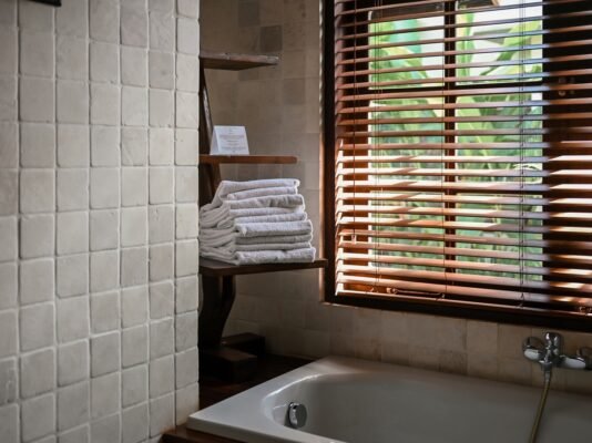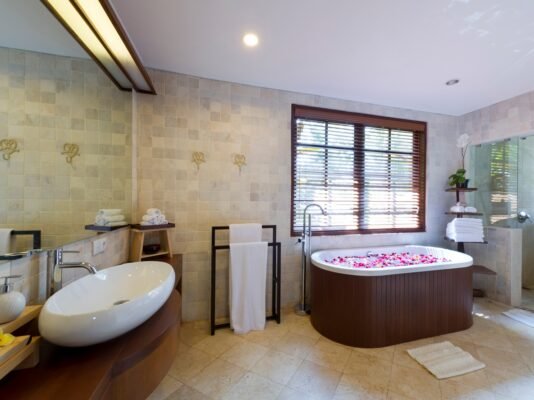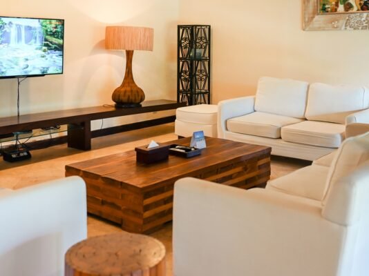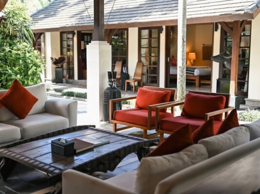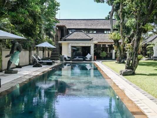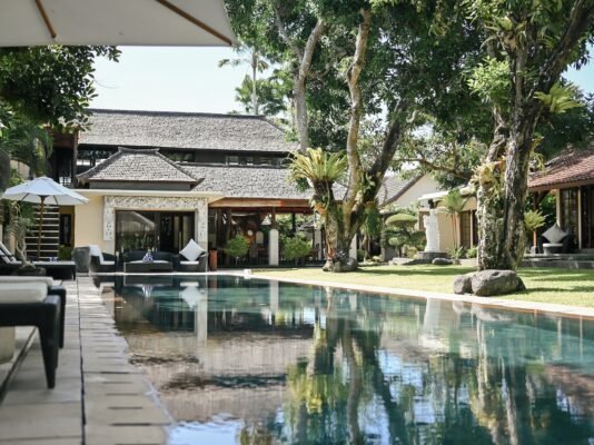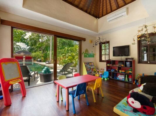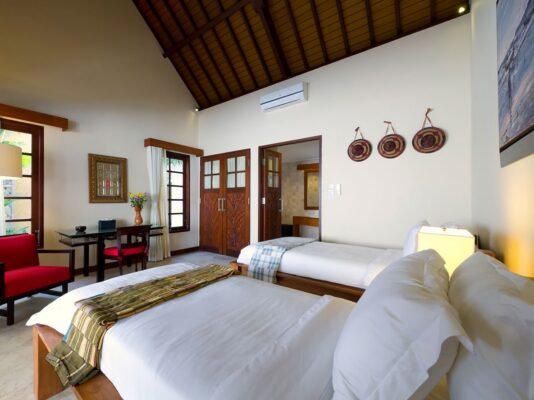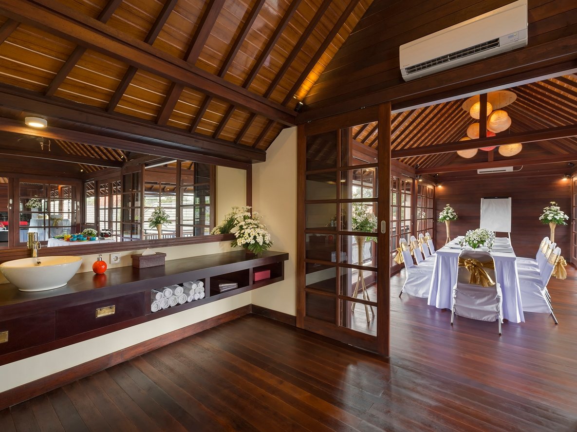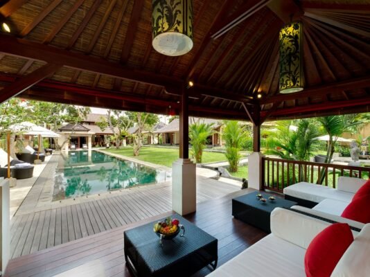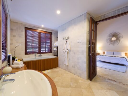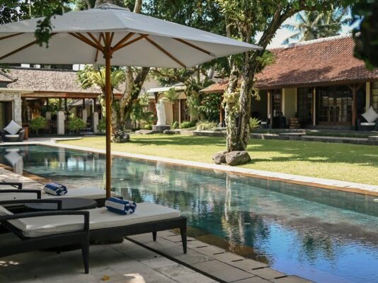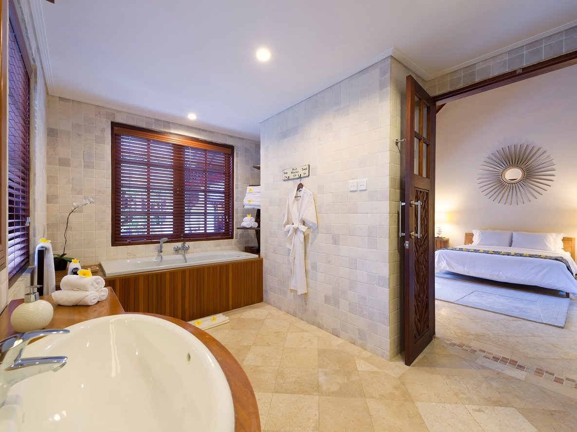 The villa comprises six spacious bedrooms: three king-bedded and three twin-bedded. French doors in each bedroom open to peaceful gardens, just steps from the pool and lawn. All suites include walk-in wardrobes and luxurious bathrooms, arranged in an L-shape for privacy.