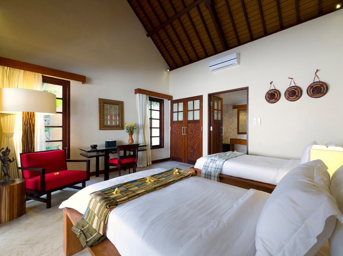 The villa’s heart is the modern two-storey living pavilion with a curated collection of wooden art pieces and open-sided living areas. The six-bedroom suites are positioned discreetly around this central pavilion, offering both privacy and easy access to communal spaces.