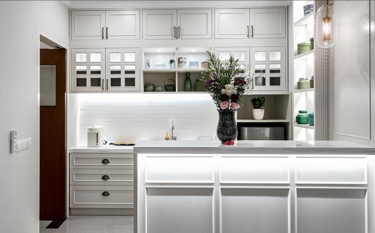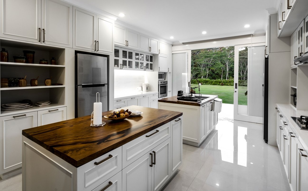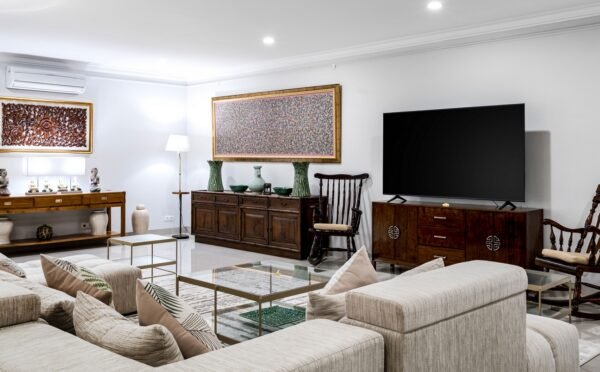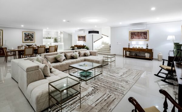 With multiple living areas spread over two floors, there’s room for everyone to unwind. Large windows open to a balcony overlooking the pool and gardens, while the gentle slope of the stairs makes the home ideal for multi-generational stays. The five spacious bedrooms, four with king beds and one twin, each have private ensuite bathrooms with bathtubs or rain showers.