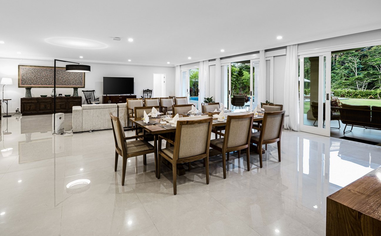 Step outside to enjoy a huge lawn, perfect for events of up to 100 guests, a shimmering pool with sculpted fountains, and serene jungle views. You can dine at the estate’s farm-to-table restaurant or prepare meals in your fully equipped kitchen—there’s even an industrial kitchen for catered celebrations.