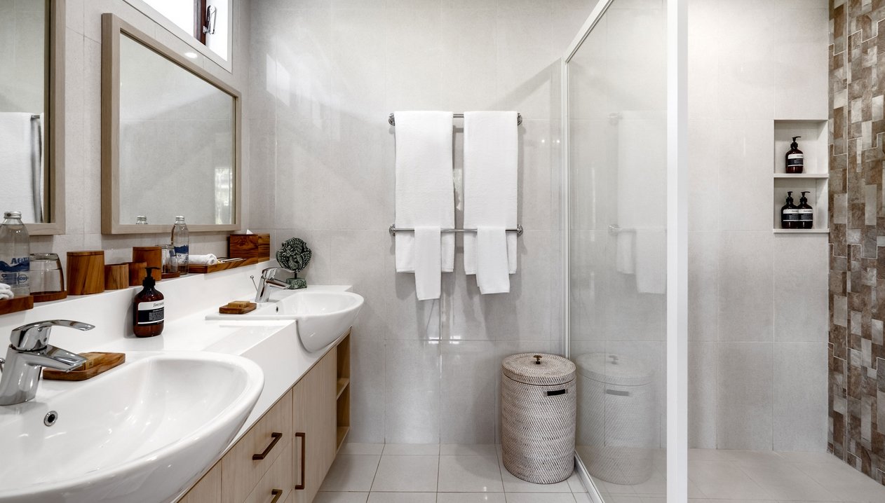 • Master Bedroom: King bed, ensuite with rain shower & twin vanities, walk-in wardrobe, pool access
