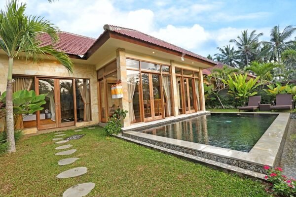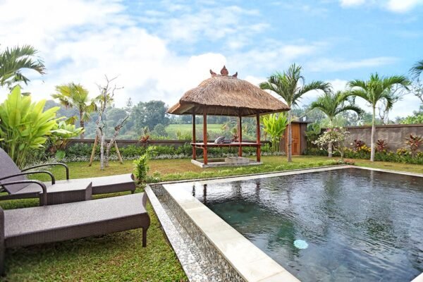With a private pool, modern facilities, and views of the lush valley, it’s ideal for couples, families, or friends looking for an authentic Balinese hideaway.