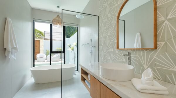 Inside, the villa blends modern aesthetics with traditional accents: